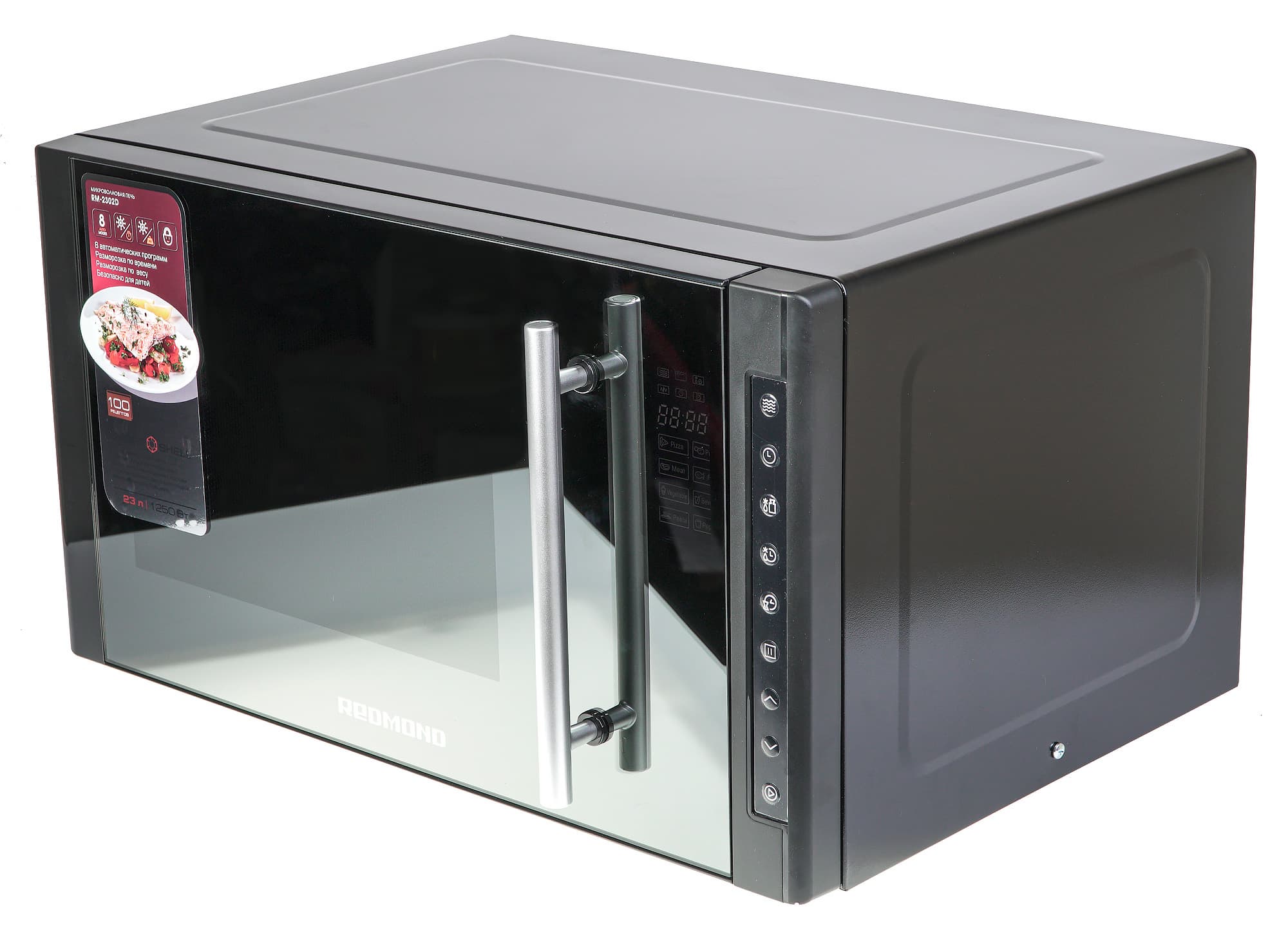 Микроволновая печь Redmond RM-2302D оснащена автоматическими программами приготовления. Всего прибор может самостоятельно подобрать параметры приготовления для восьми блюд. Причем в каждой категории пользователь имеет возможность выбора веса: