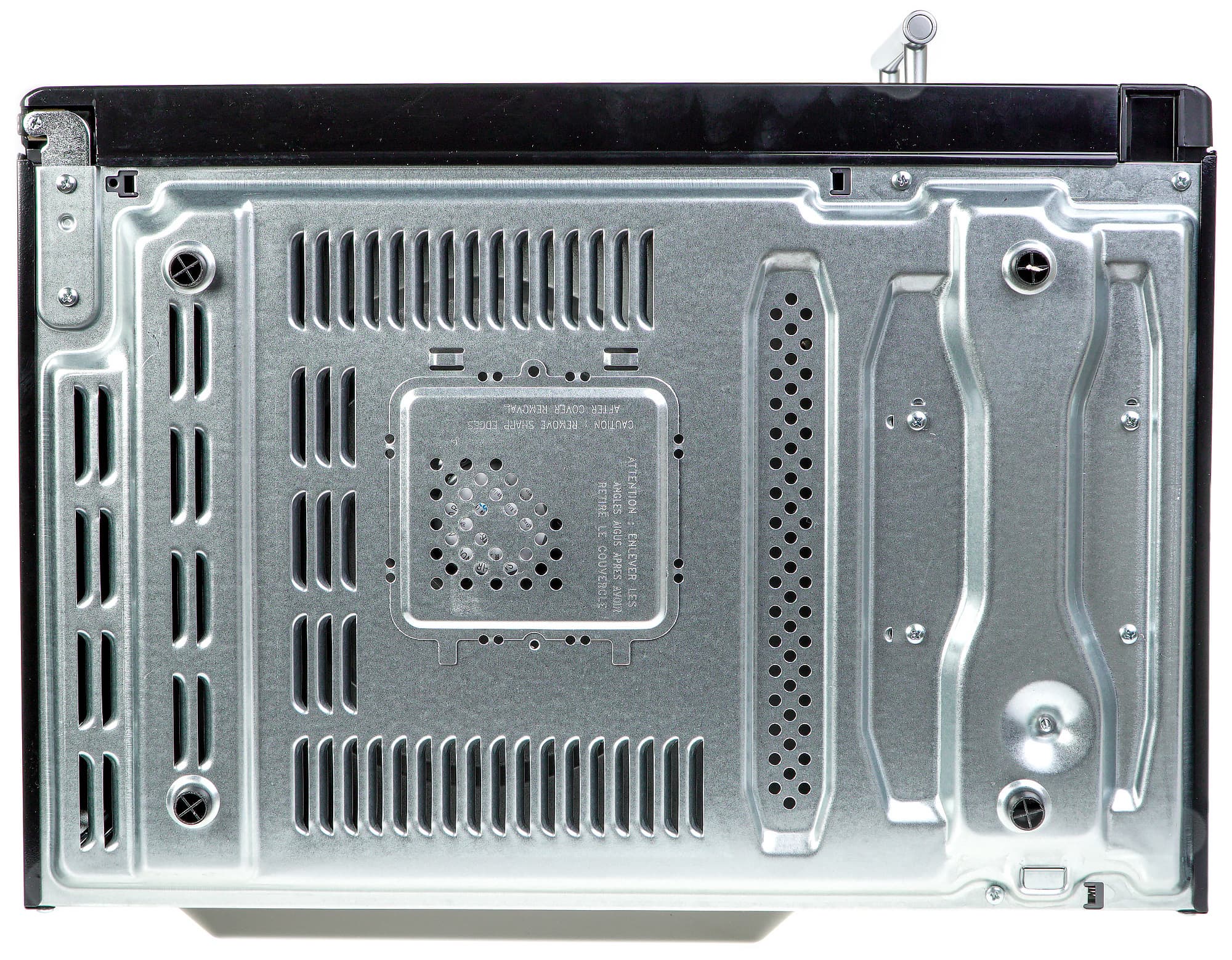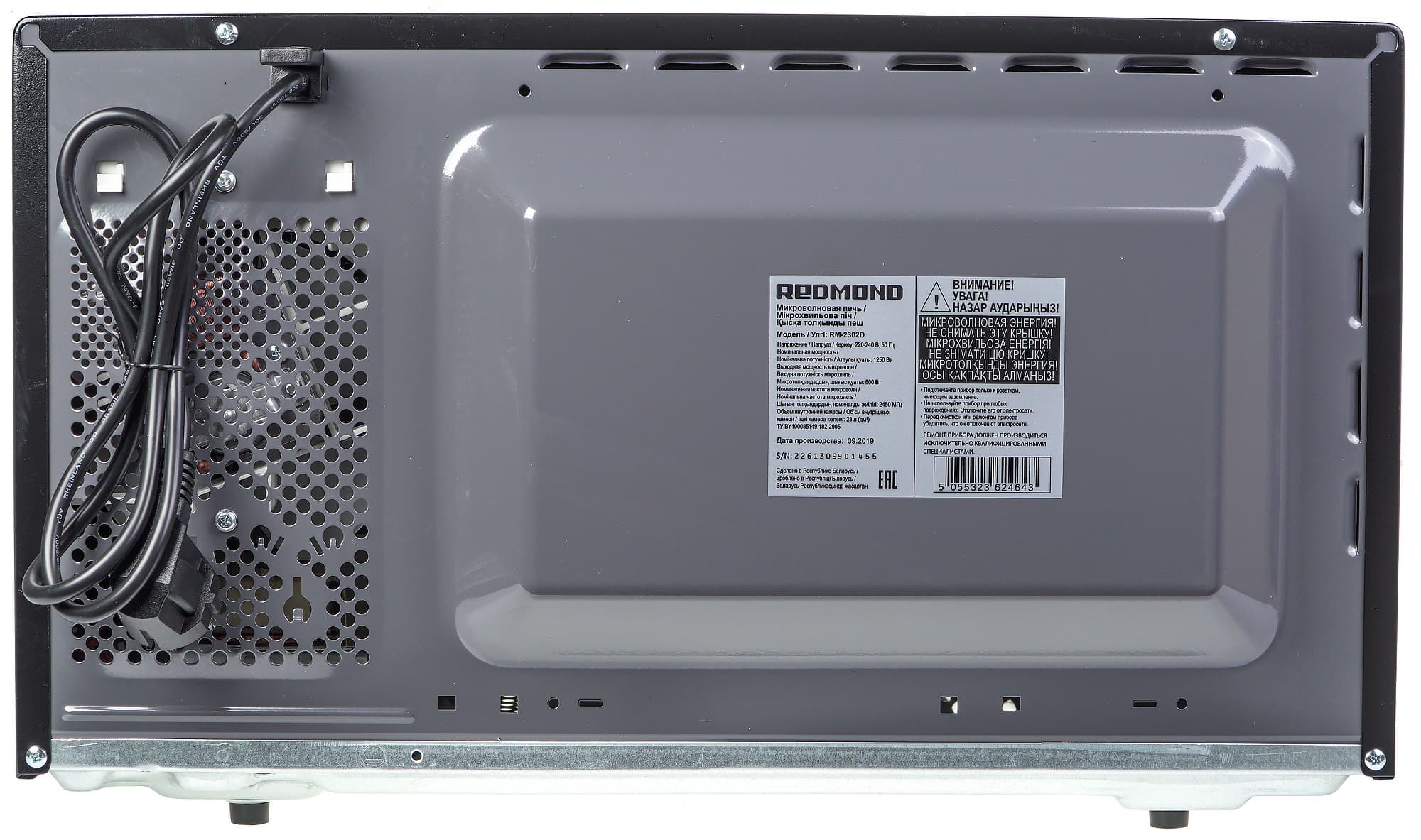 С задней стороны корпуса можно увидеть вентиляционные отверстия, наклейку-шильдик с информацией о приборе и рядом предупреждений. В верхней правой части размещен ограничитель, защищающий шнур от перегиба. Длина шнура невелика — это типичная ситуация для микроволновых печей. Так что пользователю следует предусмотреть возможность установки СВЧ-печи рядом с розеткой.
