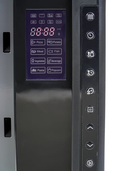 Выглядит печь, по мнению автора, весьма неплохо. Стенки корпуса изготовлены из окрашенного металла. Корпус черного цвета, дверца из затемненного прозрачного пластика — смотрится элегантно и особенно придется к месту в кухнях, оформленных в современном или хай-тек стиле. Ряд управляющих кнопок размещен в привычном месте — справа от дверцы. Дисплей был обнаружен лишь при открытии дверцы. Он находится в верхней части пластиковой планки. В черном пластике дверцы напротив дисплея вырезано прозрачное окошко, чтобы дисплей был виден при работе СВЧ-печи.