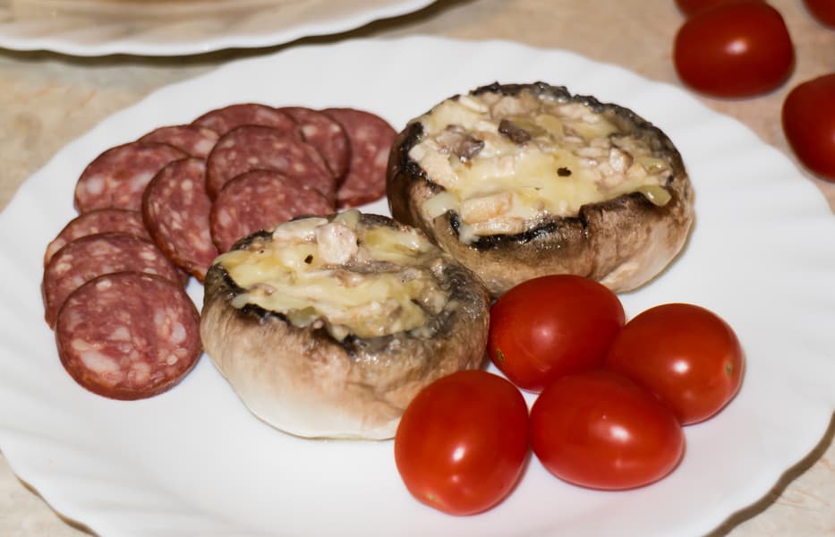 Блюдо это нам настолько понравилось, что вошло в обычный рацион по завершении тестирования. Значительно облагораживают и обогащают вкус пара ломтиков хорошей колбасы, мелко нарезанной и добавленной в начинку для фарширования грибов.