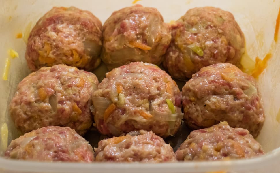 Назвать жареными лук с морковью, разумеется, было нельзя, но мы этого и не ожидали. Когда овощи остыли, начали готовить фарш для тефтелей. В фарш добавили соль, специи, измельченный чеснок, сливки и отложенные овощи. Хорошо перемешали и сформовали тефтели. Уложили их в пластиковый контейнер и залили соусом, приготовленным из томатной пасты, сметаны, воды и оставшихся овощей.