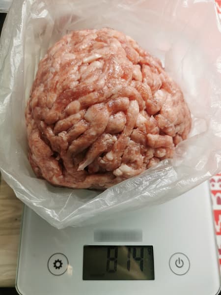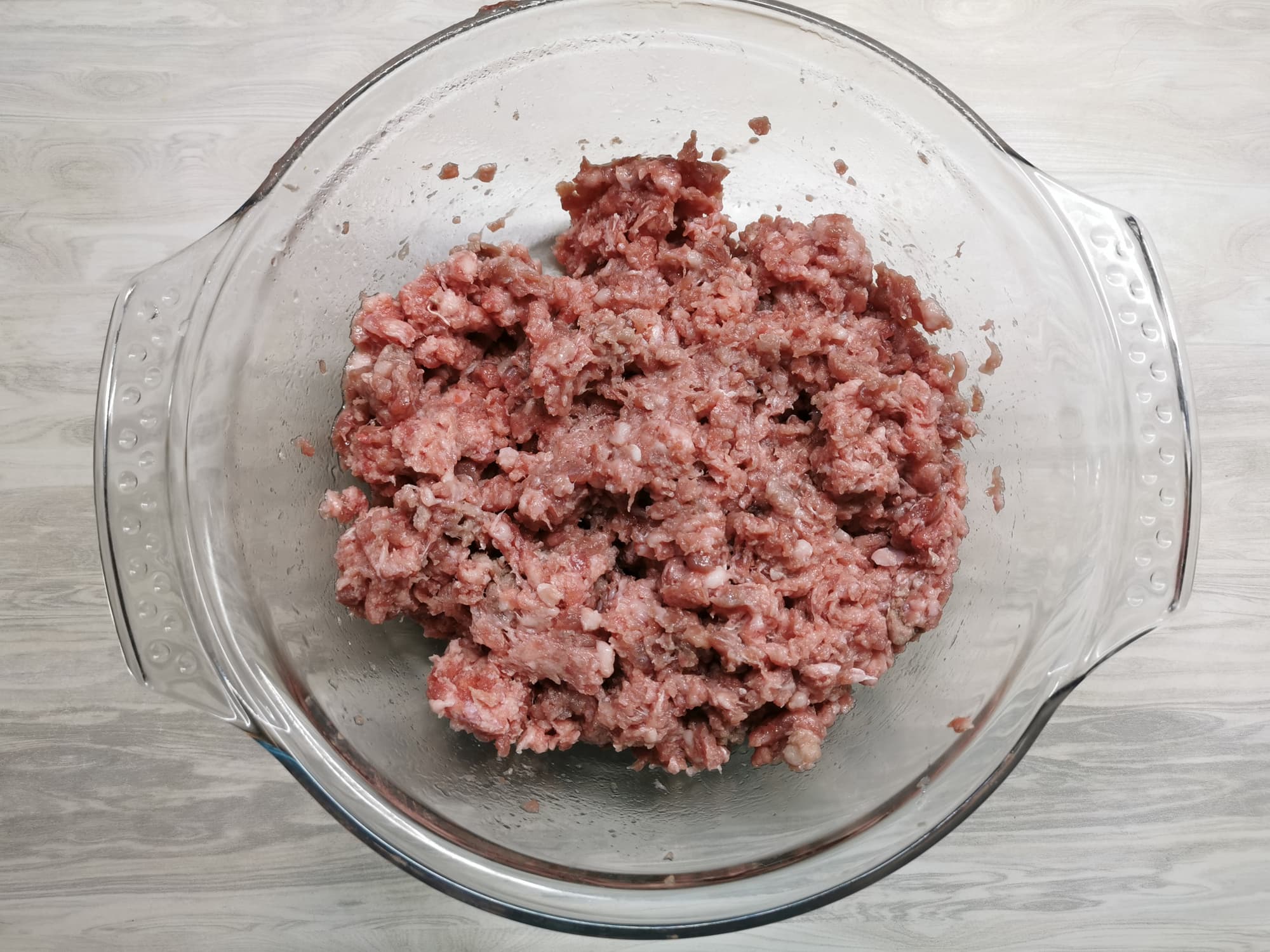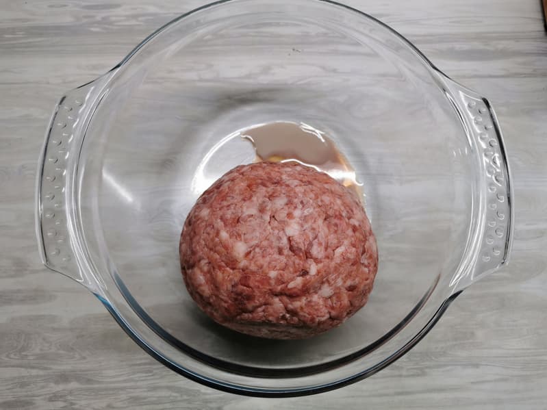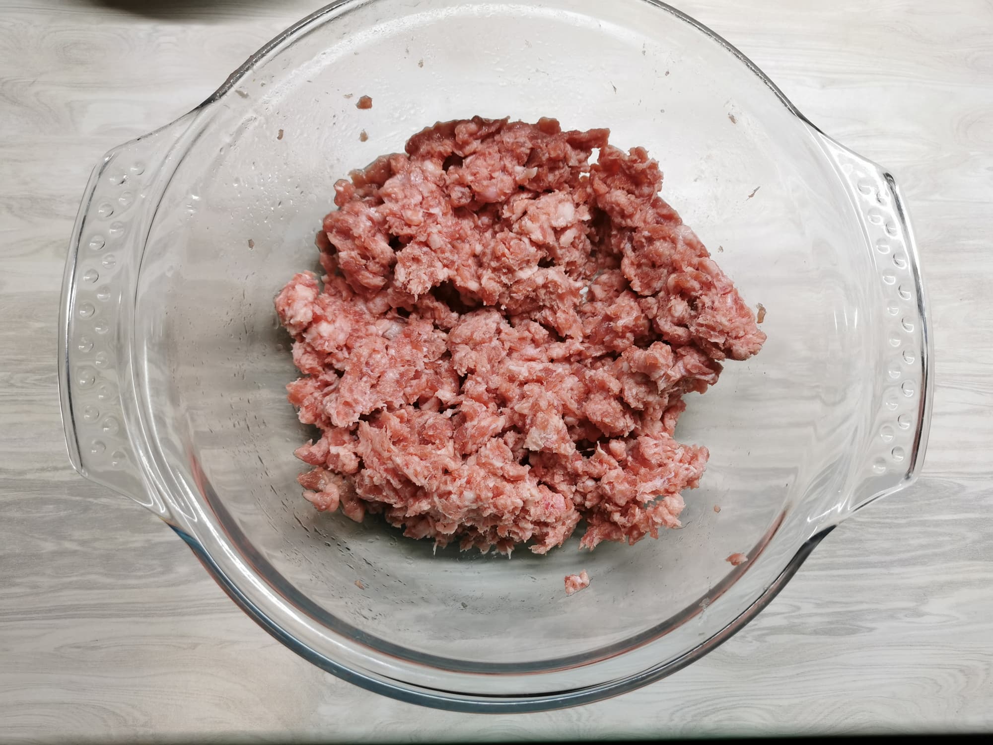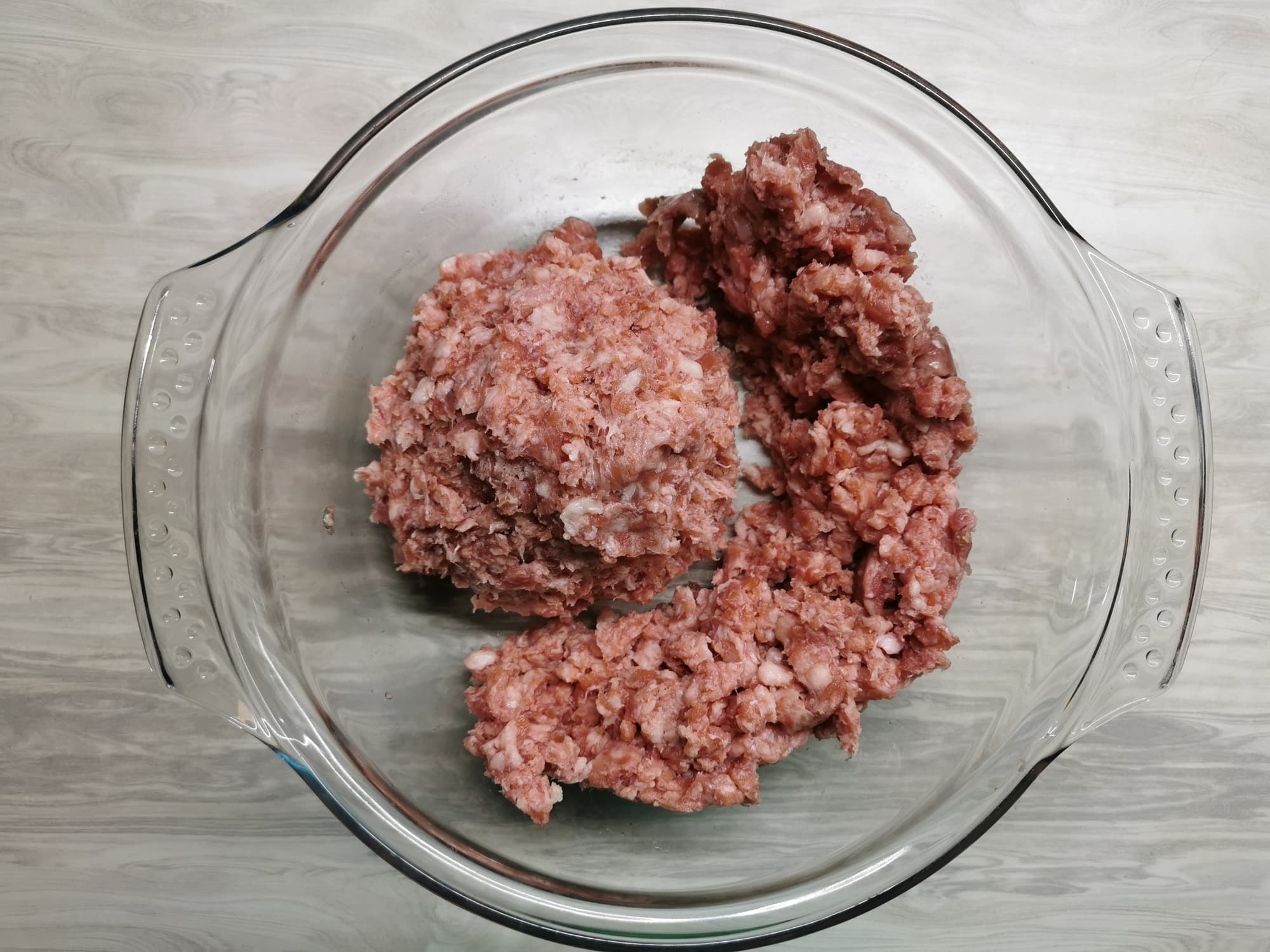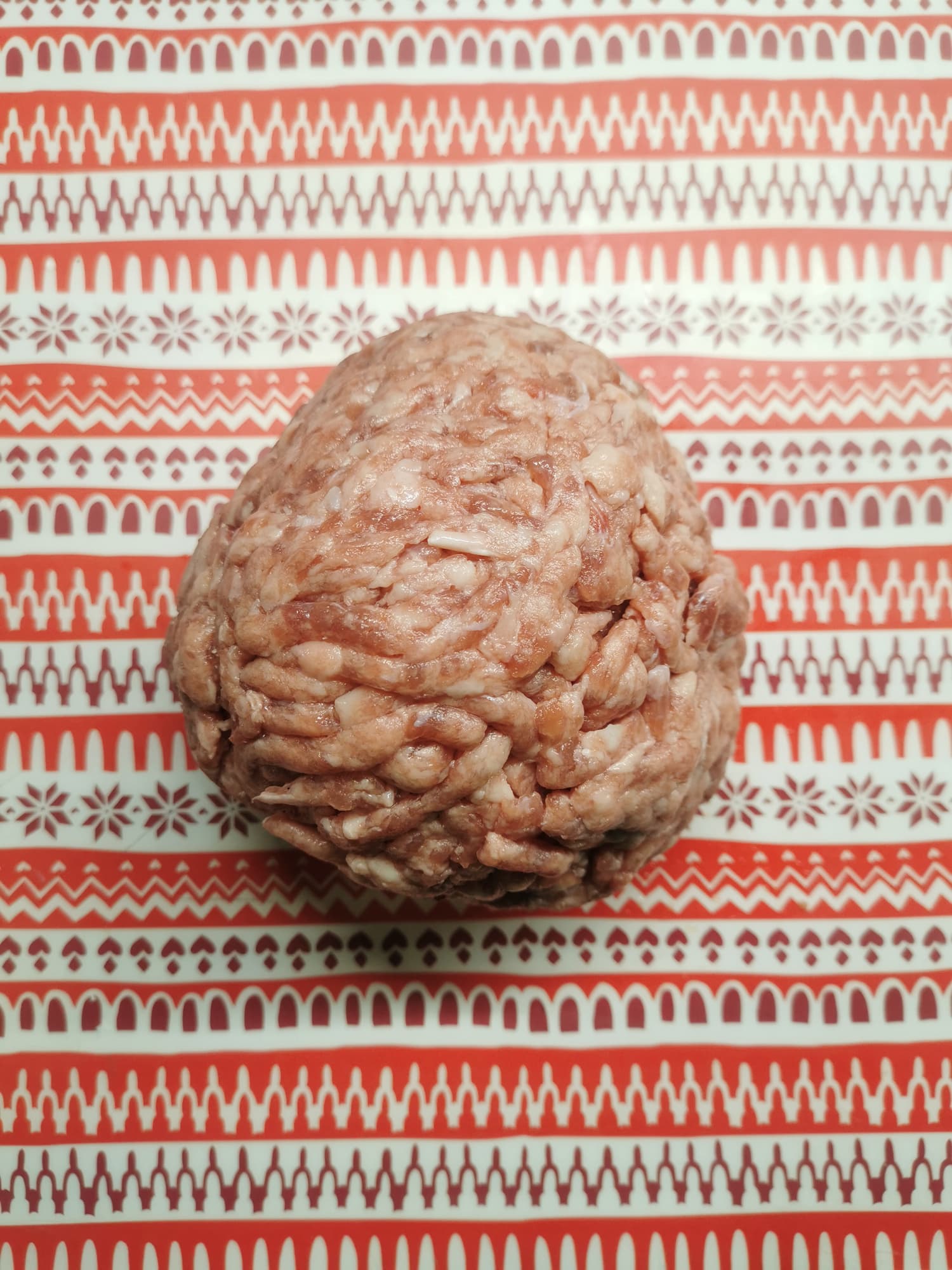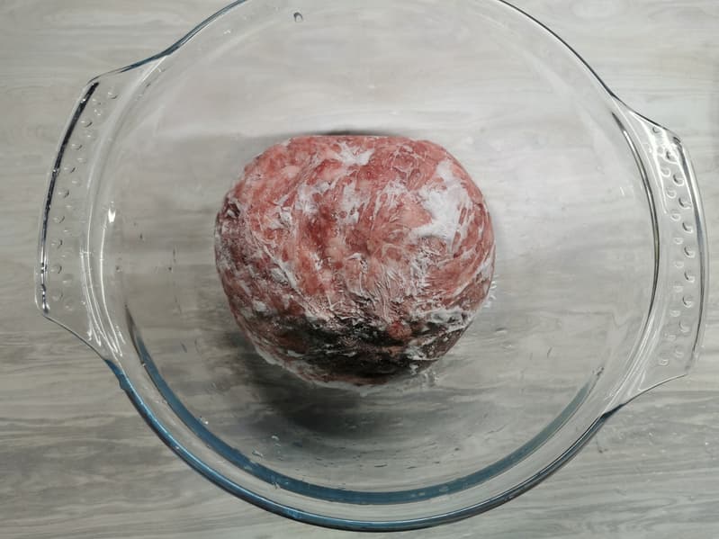Для теста мы взяли 800 г свежего фарша, слепили из него шар и заморозили.