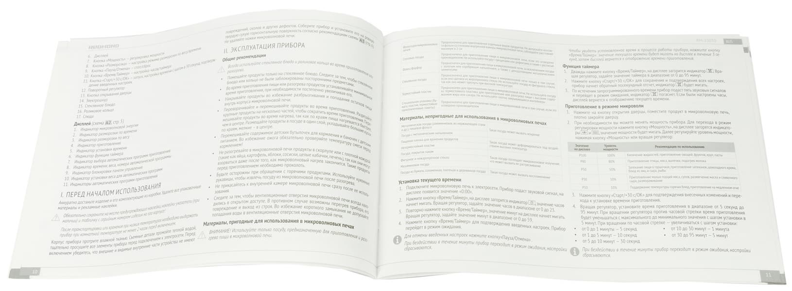 Также мы обнаружили удобные таблицы с данными по продуктам и их весу для заданных авторежимов, а также по использованию режимов разморозки, экспресс приготовления, отсрочки старта. Рецептов по приготовлению в микроволновой печи, к сожалению, здесь нет.