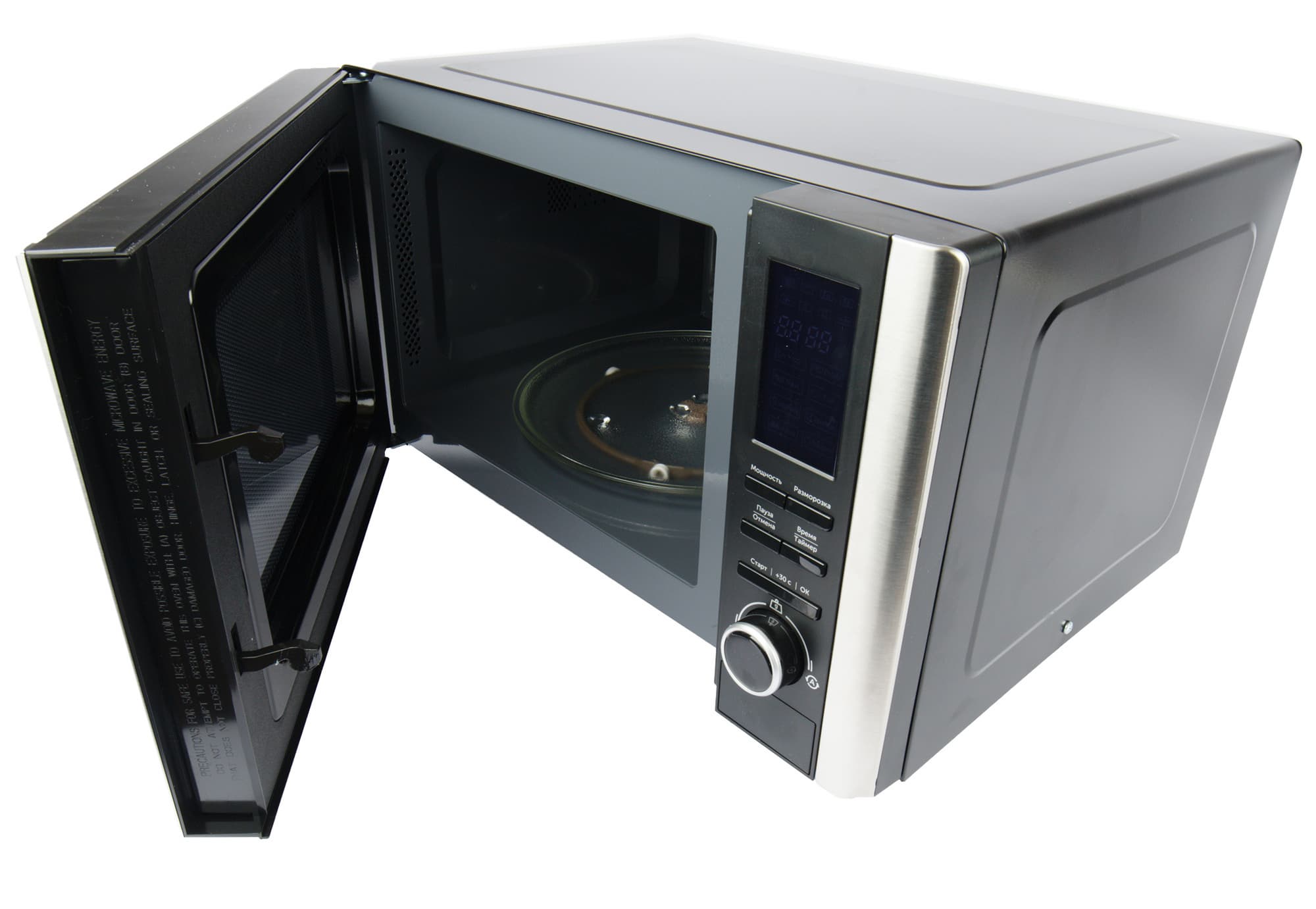 Никаких особых наворотов производитель нам не обещает — ни гриля, ни конвекции здесь не предусмотрено. Зато у устройства имеется русскоязычное наименование кнопок (пожалуй, это уже можно было бы отнести к плюсам, поскольку ни один символ не будет так понятен, как слово), 8 автопрограмм, износостойкое полимерное покрытие камеры, которое должно выдерживать интенсивный нагрев, не деформироваться и не менять со временем цвет, и функция поэтапного приготовления, позволяющая после разморозки сразу запустить подогрев.