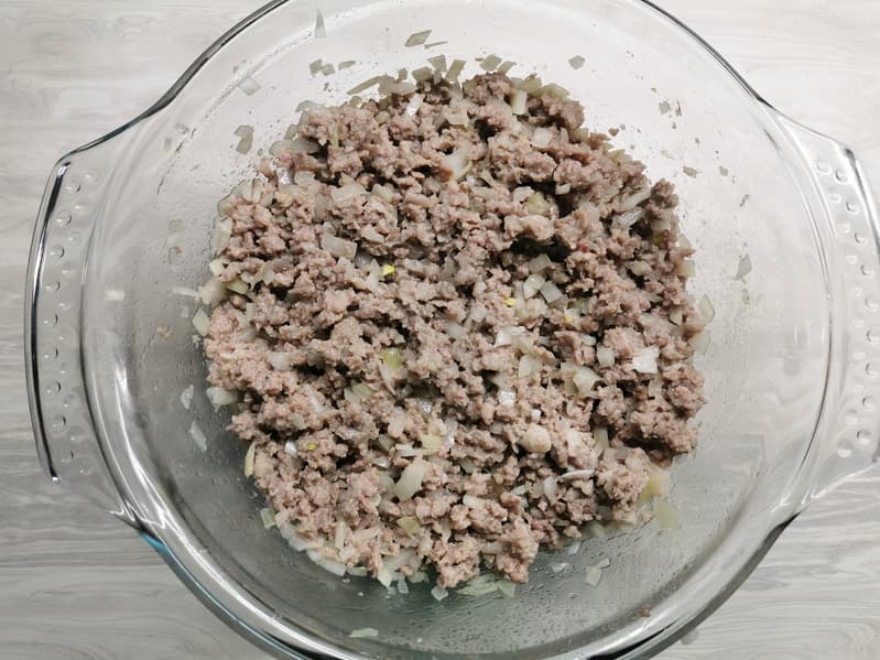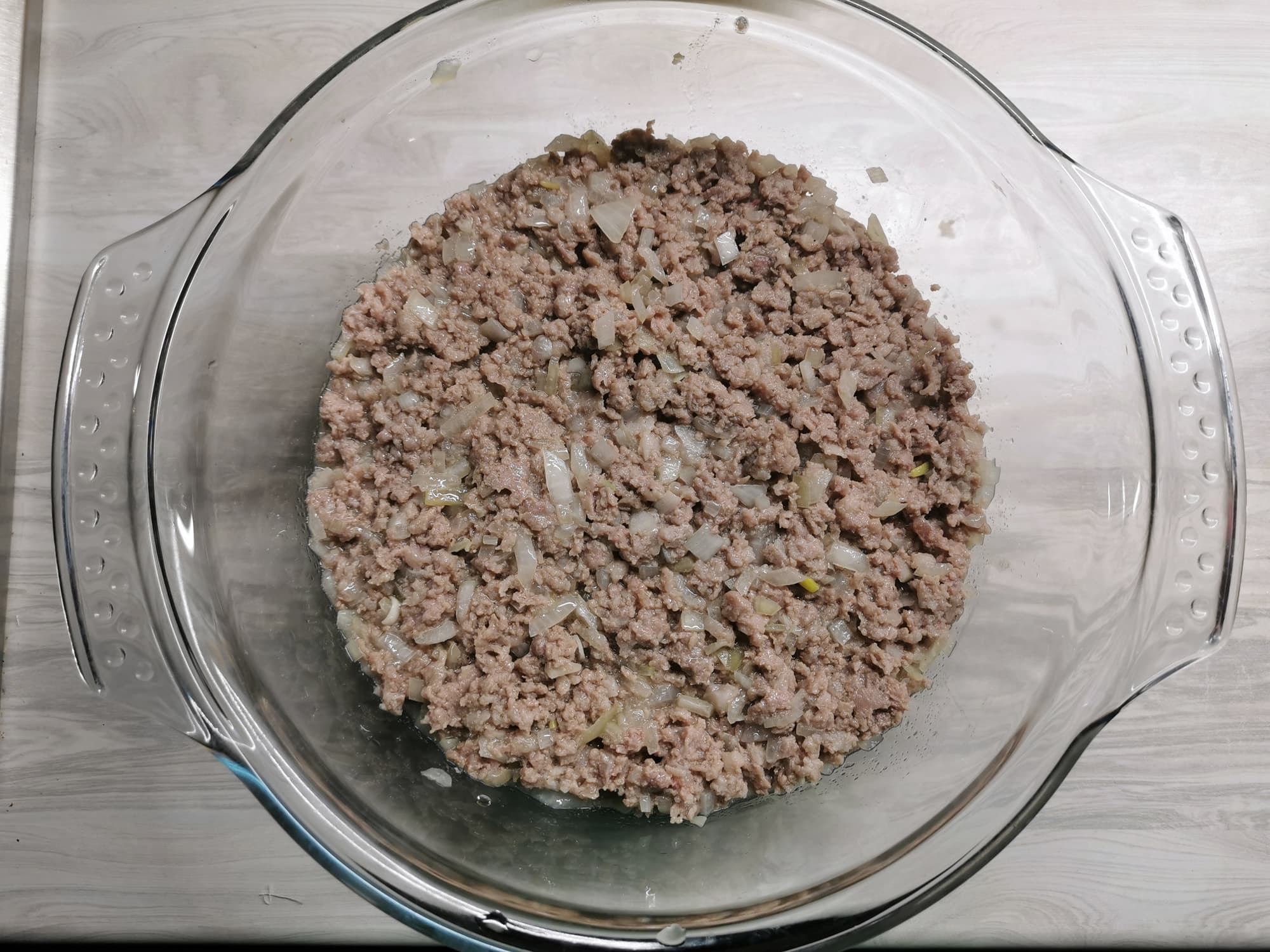 После чего отправили на 8 минут в микроволновку, установив максимальную мощность. Фарш отлично пропекся, а лук стал мягким.