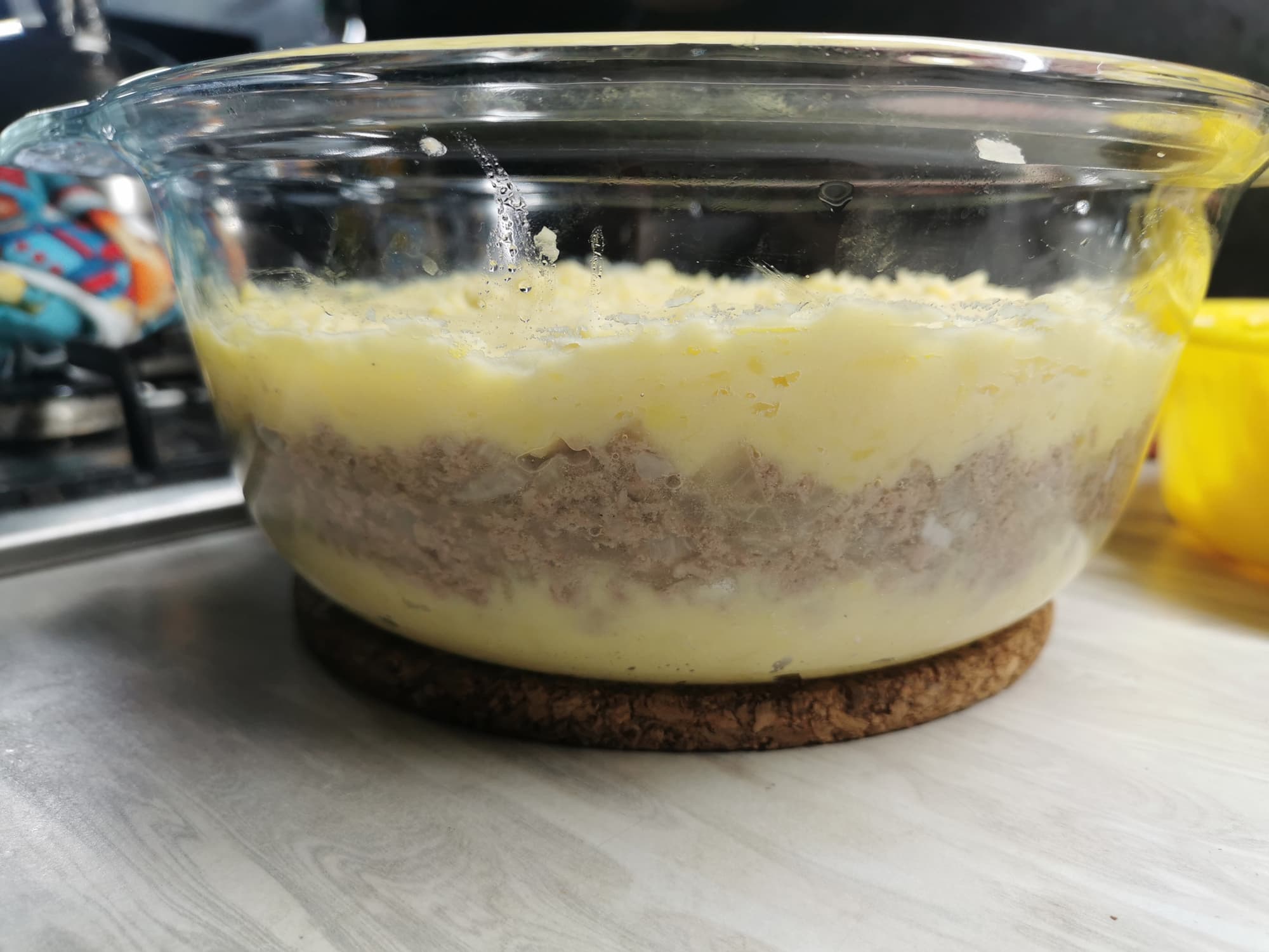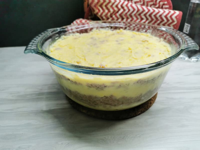 Далее мы переложили готовый фарш в другую посуду и разложили пюре с фаршем слоями до самого верха в нашей форме для запекания.