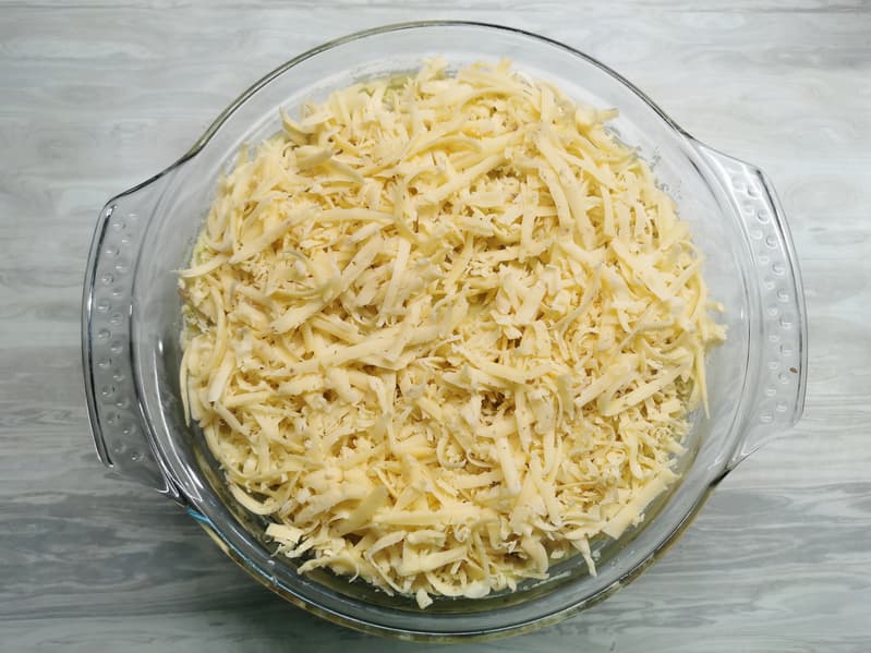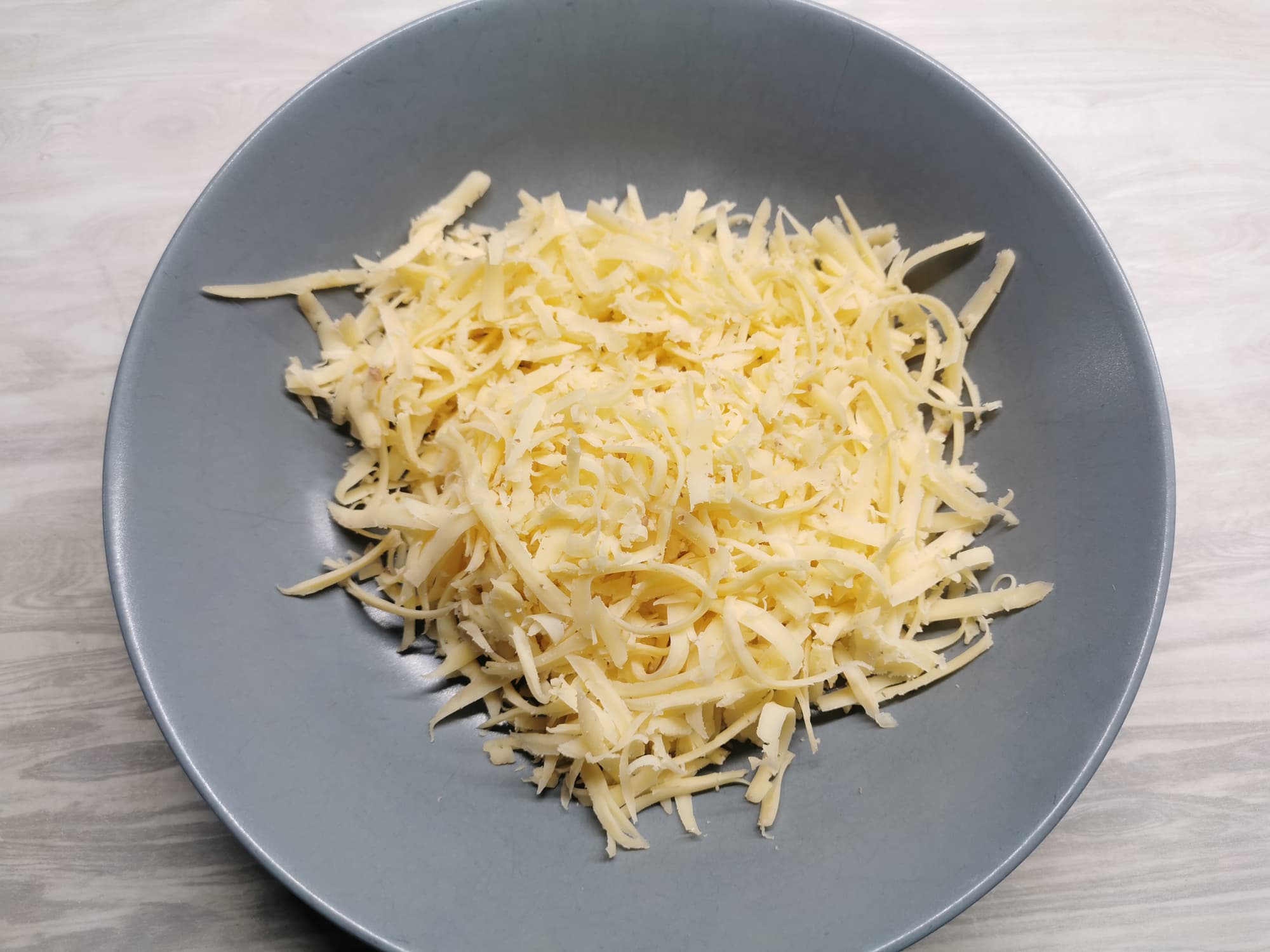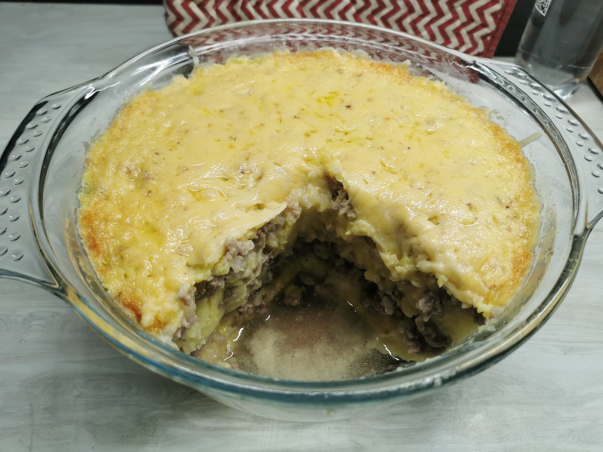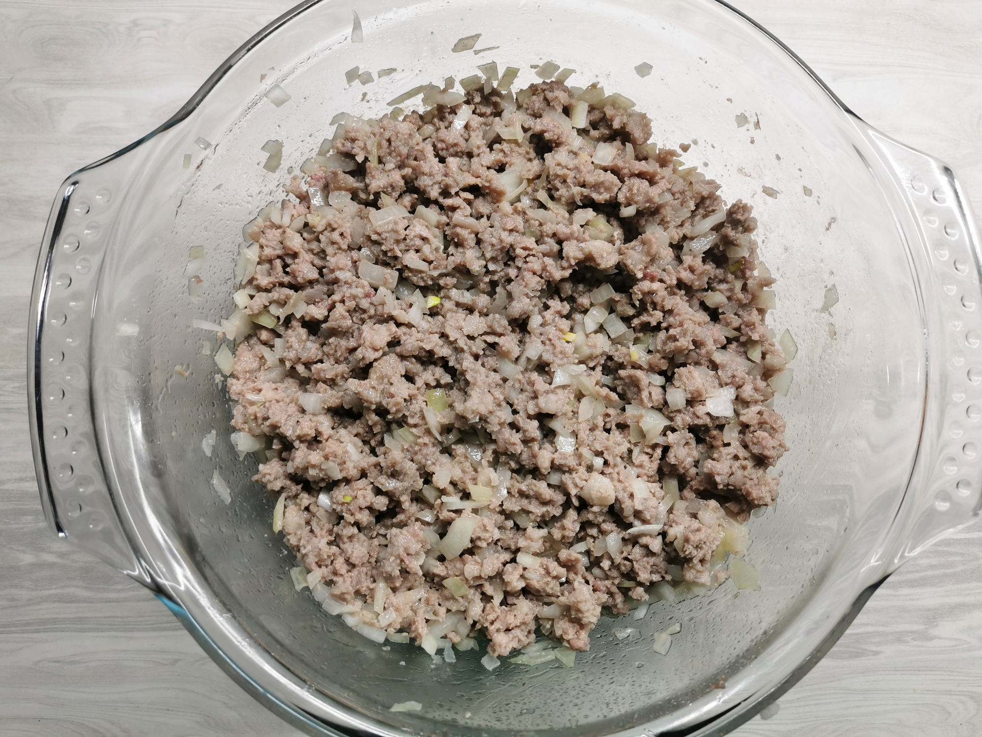 Для запеканки мы использовали приготовленное в предыдущем тесте картофельное пюре и домашний фарш, который также ранее разморозили для теста. Помимо этого нам понадобились: сыр, репчатый лук, 2 куриных яйца, соль и черный молотый перец.