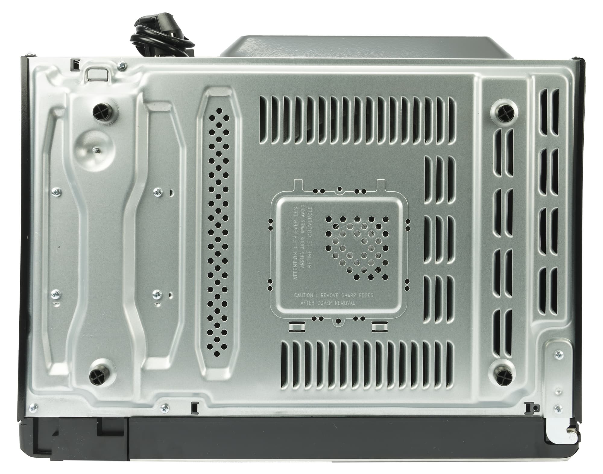 Если посмотреть на печь сзади — мы видим технические и вентиляционные отверстия, вывод шнура и сам шнур с вилкой, значительно выгнутый назад защитный экран и наклейку с краткой технической информацией об устройстве.