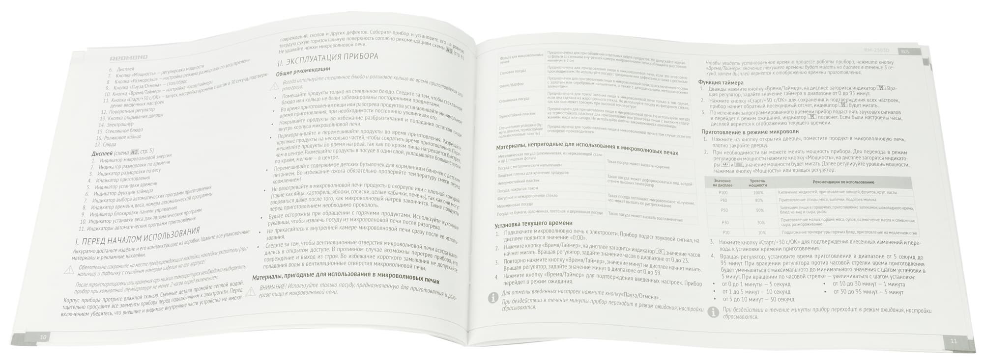 Внутри руководства по эксплуатации можно найти инструкцию по технике безопасности, по правильной утилизации прибора, его технические характеристики, подробно описывается управление и работа печи в разных режимах.