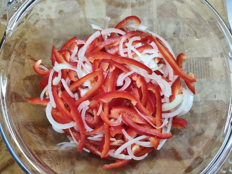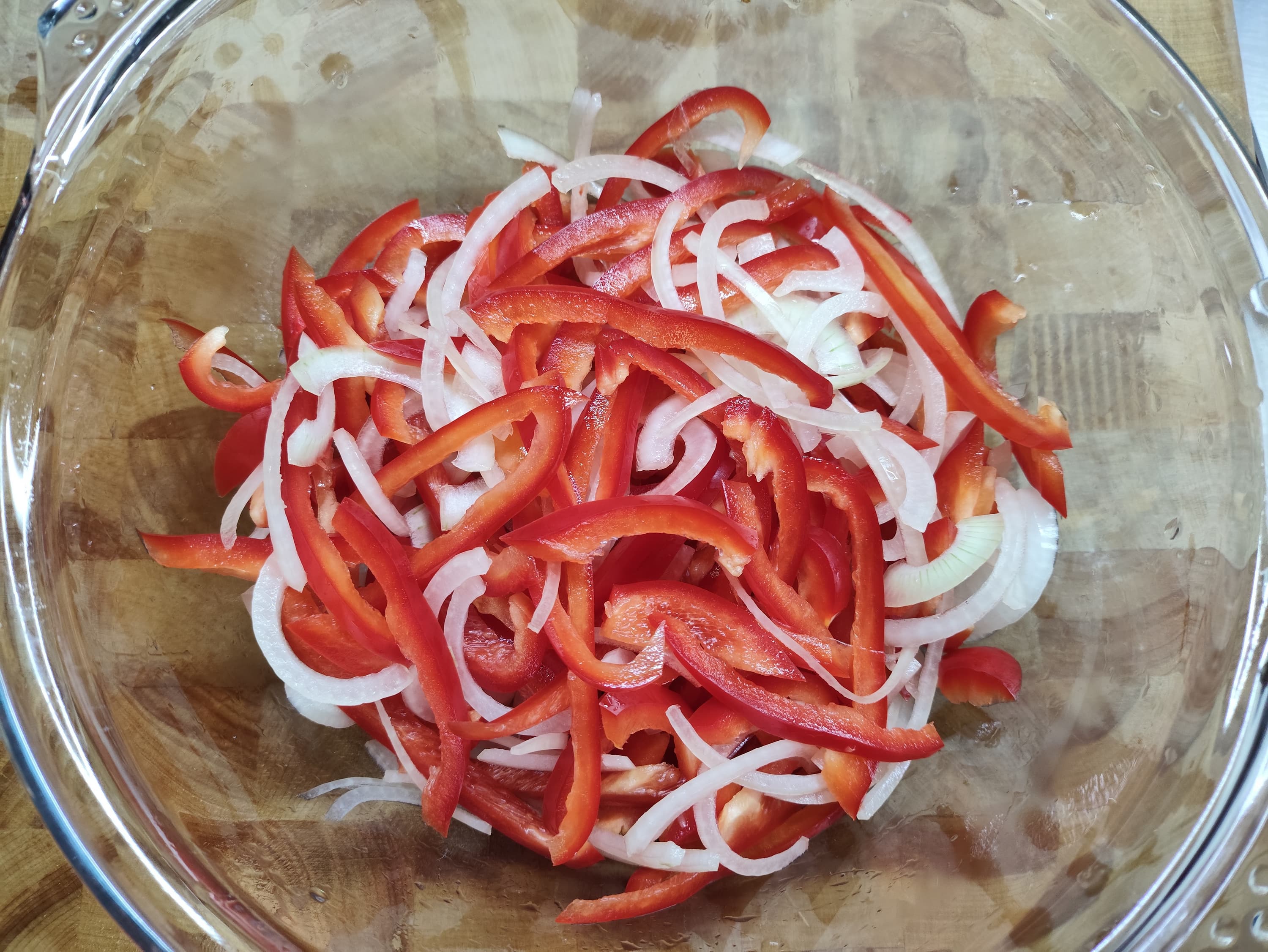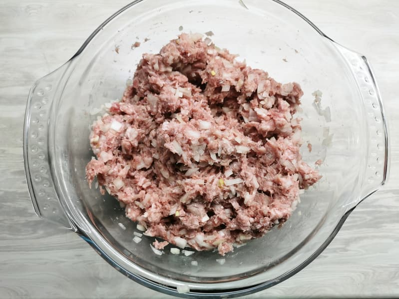 Далее занялись фаршем: смешали его с мелко нарезанным репчатым луком, посолили и тоже слегка поперчили.