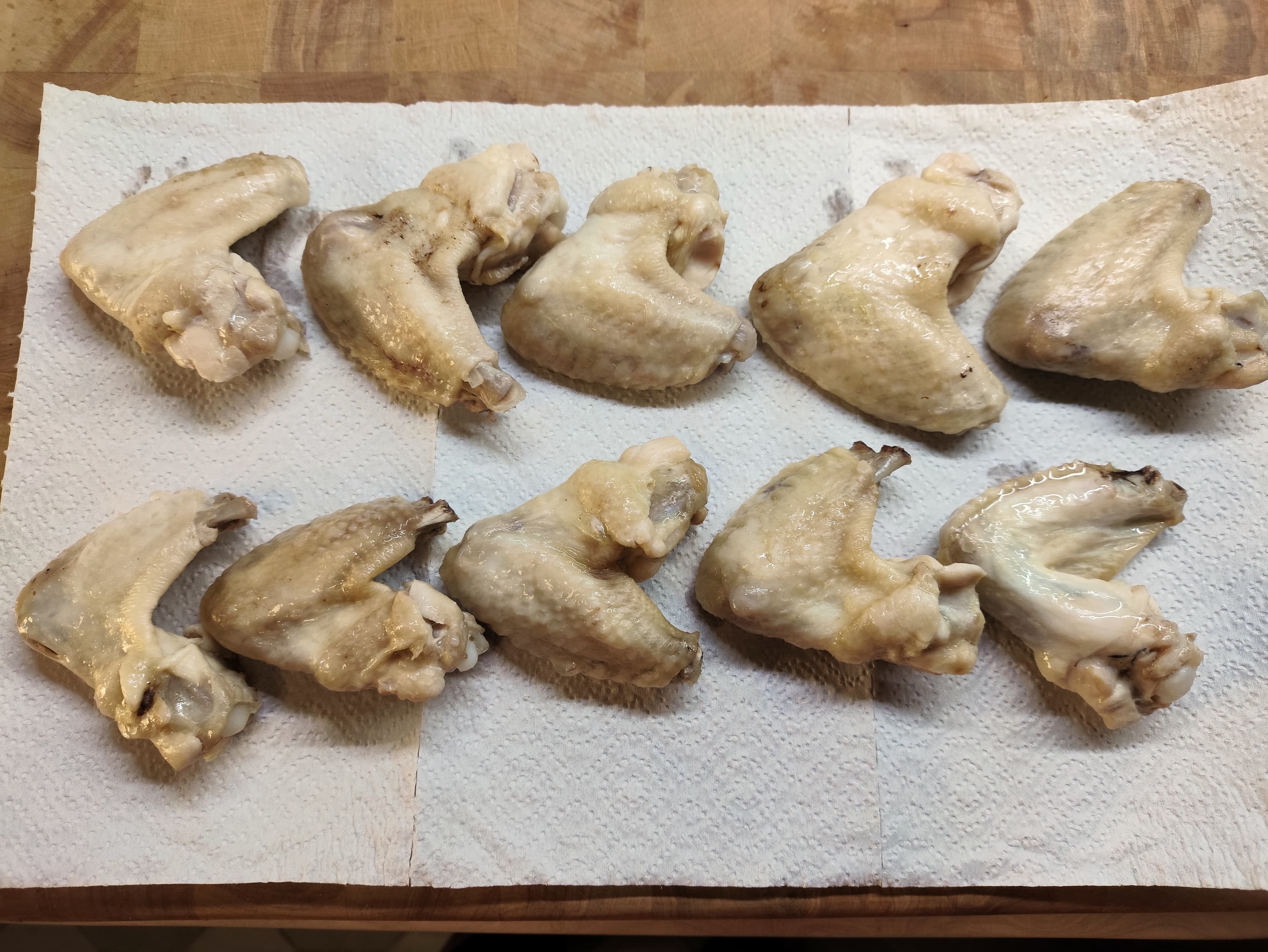 Сливаем жидкость через дуршлаг, сушим крылья бумажными полотенцами...