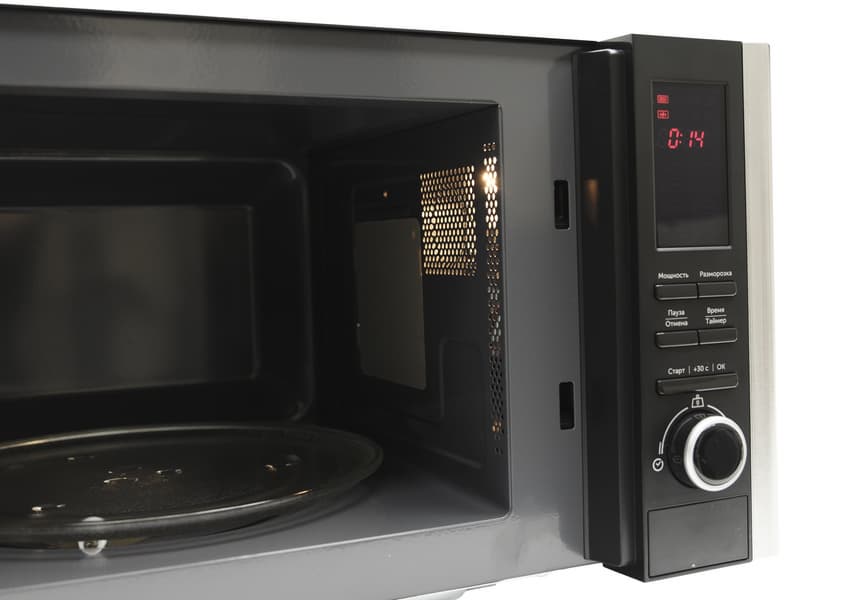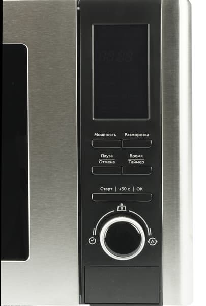 Кнопка «Мощность» даст возможность выбора мощности — от 100% до 10% с шагом в 10 единиц. Выбор можно сделать, вращая колесико. Вторая кнопка «Разморозка» даст возможность запустить программу разморозки продуктов, выбрав их наименование и вес вращением колесика. Третья кнопка «Пауза/Отмена» поможет остановить процесс приготовления либо отменить нажатие любой из прочих кнопок. Четвертая кнопка поможет установить на дисплее время или запустить отложенный старт до 95 минут с шагом в минуту. Пятая кнопка является кнопкой подтверждения выбора, «Быстрым стартом» и мгновенно начнет работу на максимальной мощности в течение минуты, а также прибавит к любому времени приготовления еще 30 секунд.