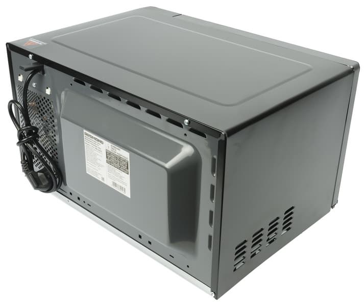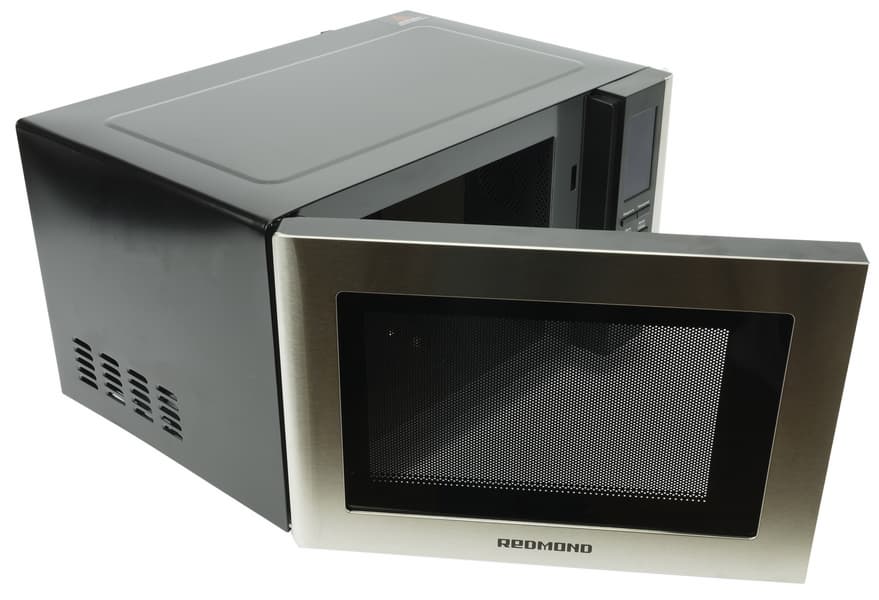 Микроволновая печь Redmond RM-2303D в основном чёрного цвета и только дверца, задняя и нижняя поверхности не имеют цветного покрытия — они металлические.