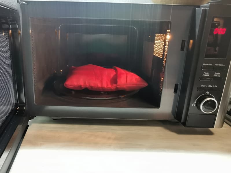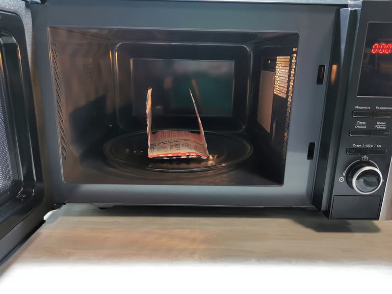 Пакетик с зернами положили на стеклянный столик внутри камеры и установили данные веса для запуска автопрограммы. Микроволновая печь установила время работы 2 минуты 30 секунд.