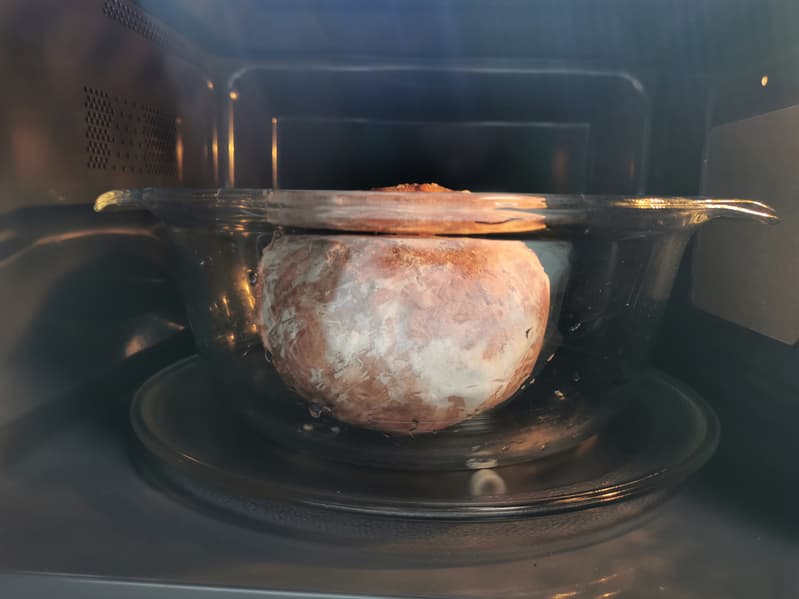 По истечении времени мы достали форму с фаршем из микроволновой печи и выяснили, что с внешних сторон шар размягчился до идеальной консистенции свежего фарша, а вот его «ядро» осталось подмерзшим.