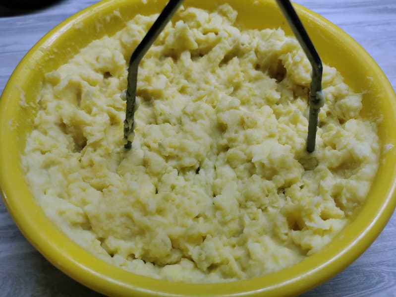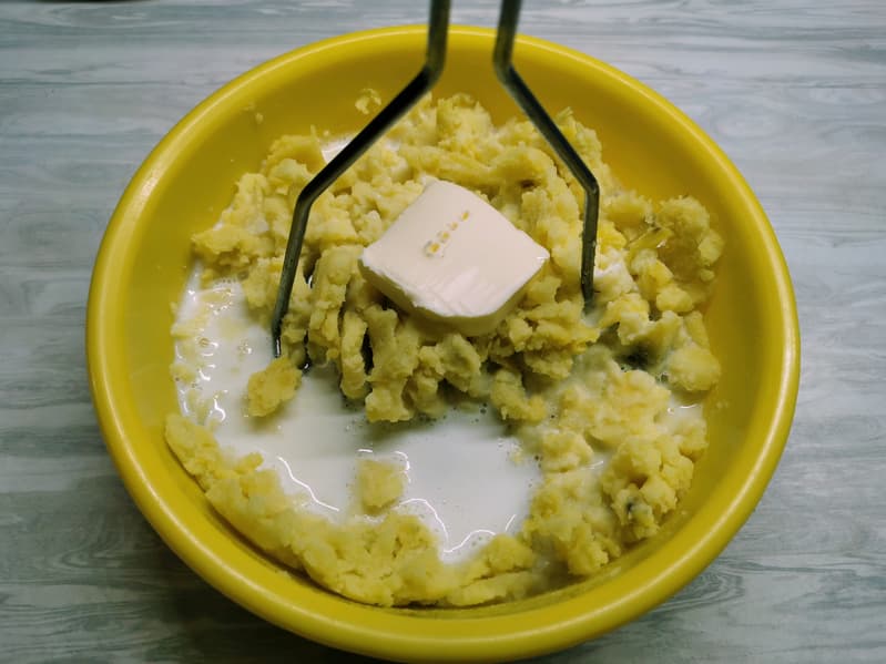 Горячий картофель мы переложили в глубокую миску, добавили соль, сливочное масло и молоко и хорошенько размяли его толкушкой.