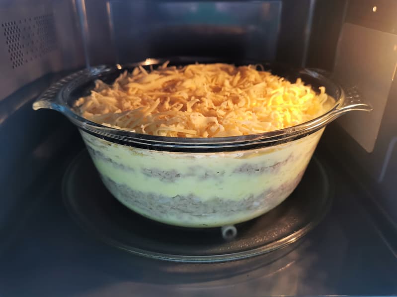 Затем запеканка отправилась в микроволновую печь на 20 минут при мощности 80%. Потребление на этом этапе составило 0,3 кВт·ч.