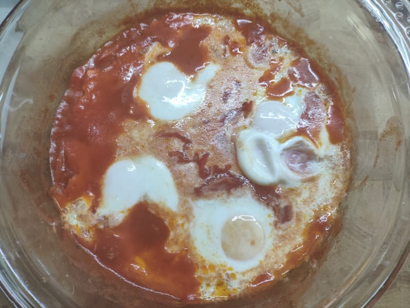 Снова накрываем пищевой пленкой и ставим в микроволновку. На этот раз нужно быть внимательными: яйца не должны полностью свариться, желток должен быть не твердым, а жидковатым. Нам хватило пяти минут.