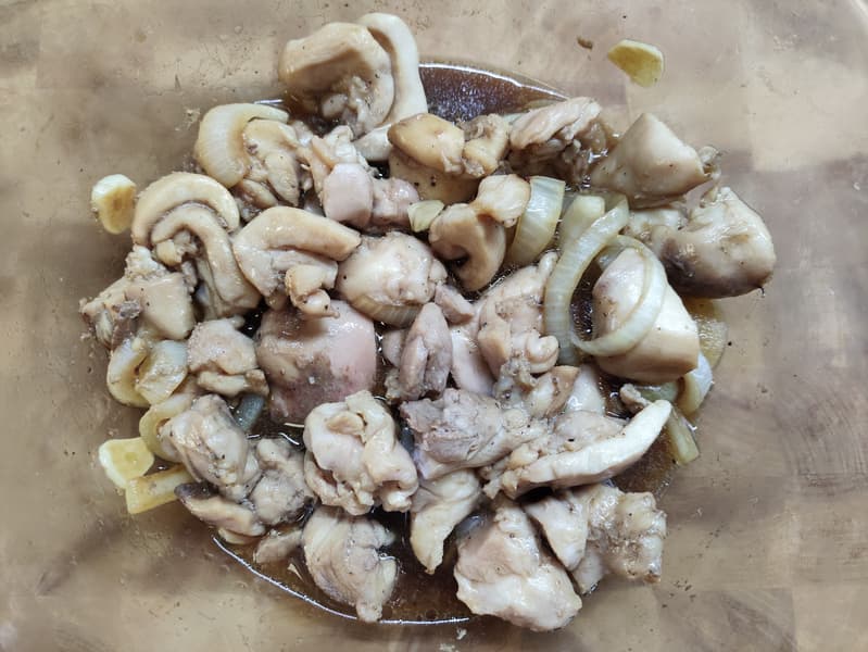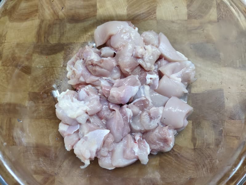 Отделяем мясо от костей, удаляем кожу. Куриная грудка нам тут не подойдет — она в микроволновке с довольно высокой вероятностью пересушится и станет жесткой, поэтому берем голень.