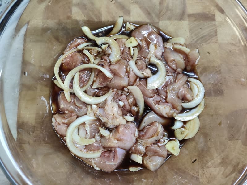 Добавляем нарезанный лук, немного соевого соуса, рисовое вино, чеснок, соль и молотый перец. Можно оставить мариноваться на полчаса. А можно готовить сразу.