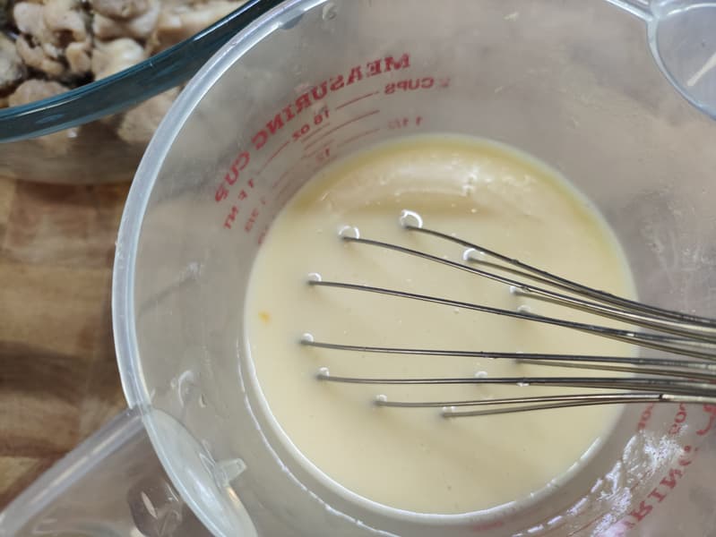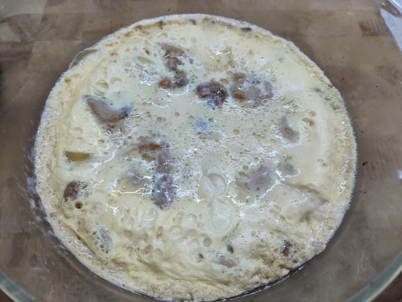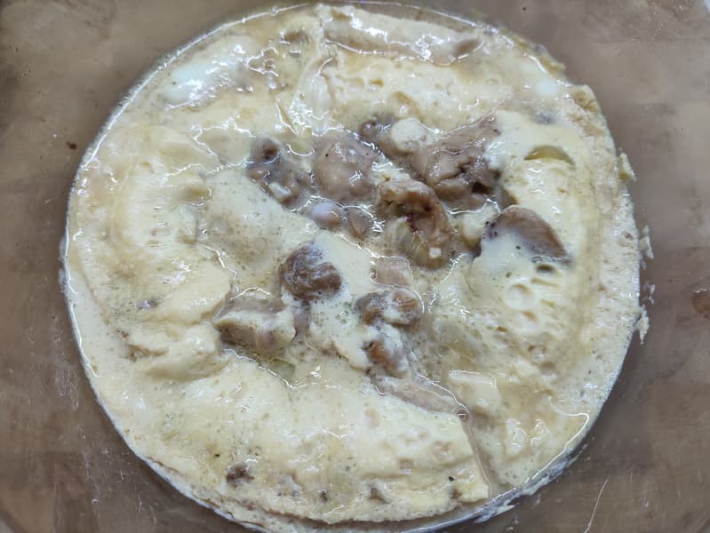 Если видим, что часть яично-бульонной смеси осталась жидкой — слегка перемешиваем и добавляем еще минуту.