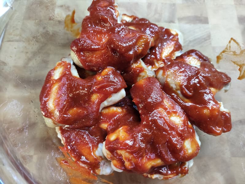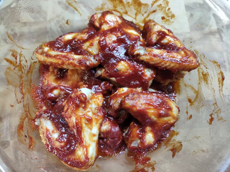 Добавляем примерно ⅔ соуса, по возможности распределяя его равномерно (оставшуюся треть используем позже для макания готовых крылышек при еде).