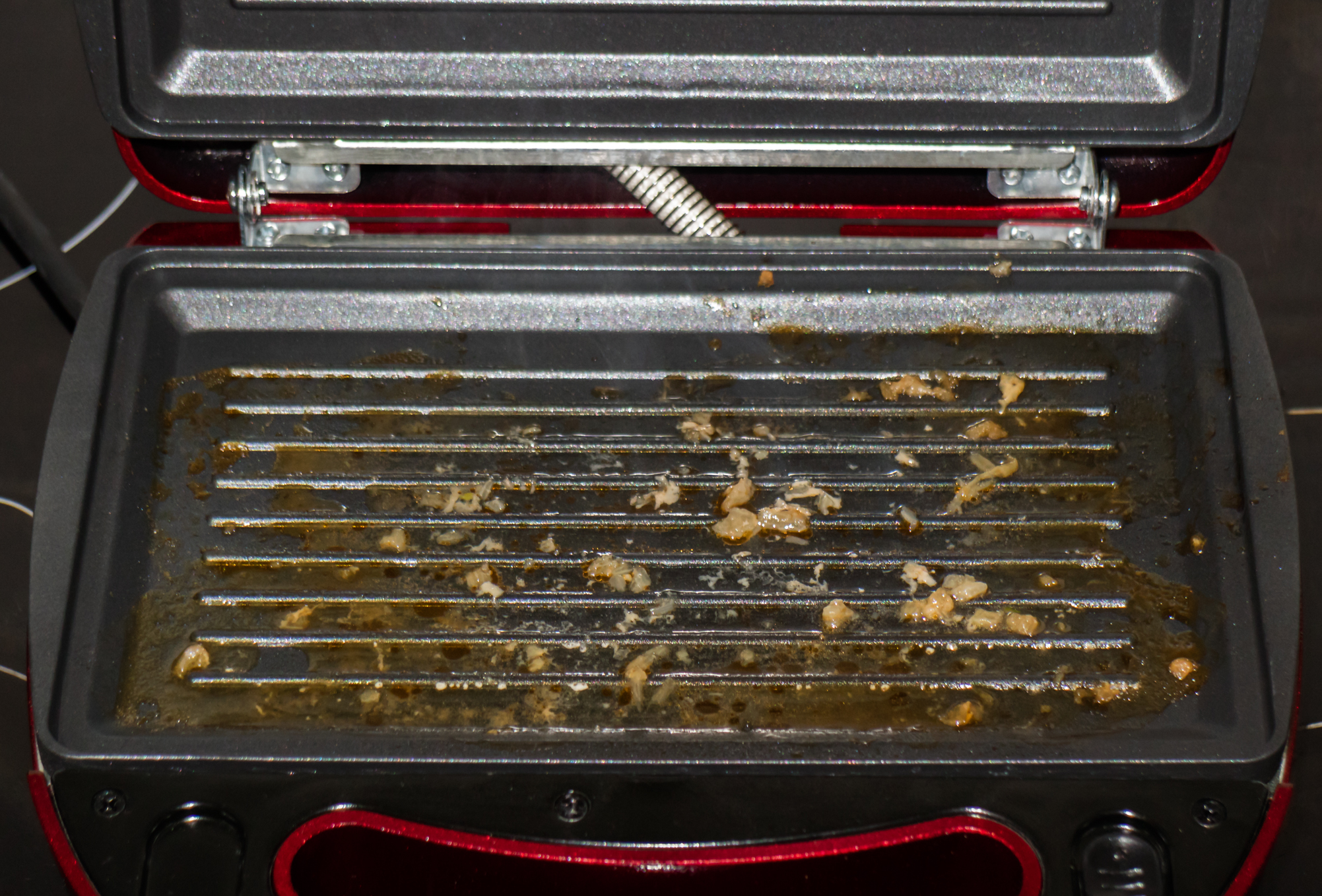Все-таки факт стекания мясного сока за пределы панелей нас не сильно радует. Тем более что при следующем включении вытекший жир начал прогорать. За одну итерацию лучше жарить один кусок — в противном случае выделяющаяся из мяса влага будет не успевать испаряться, и блюдо получится больше тушеным, чем приготовленным на гриле.