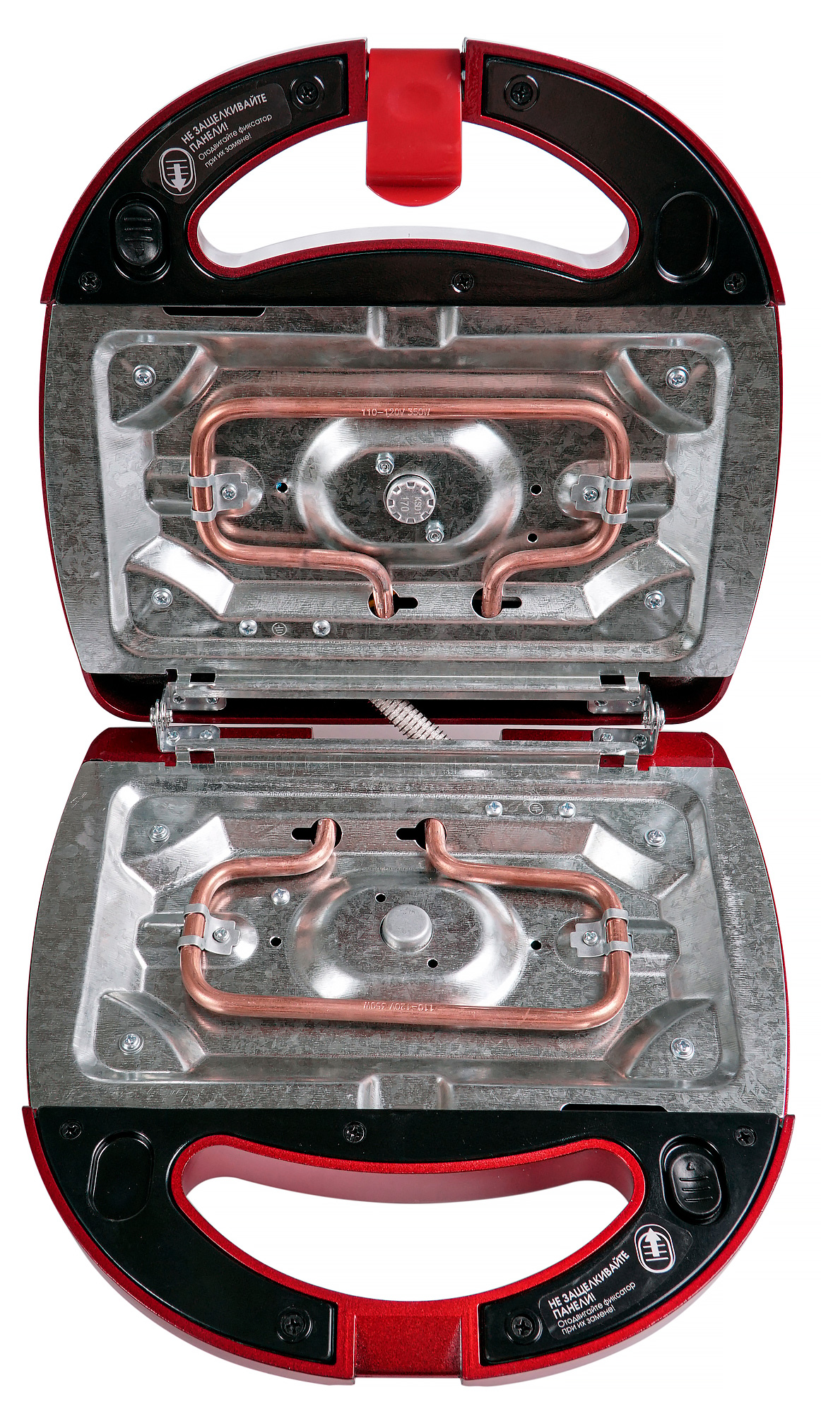 В закрытом положении мультипекарь фиксируется посредством накидной защелки на ручках. Двухуровневая защелка позволяет выпекать изделия в двух положениях — панели могут соприкасаться или же находиться на некоторой высоте друг от друга.