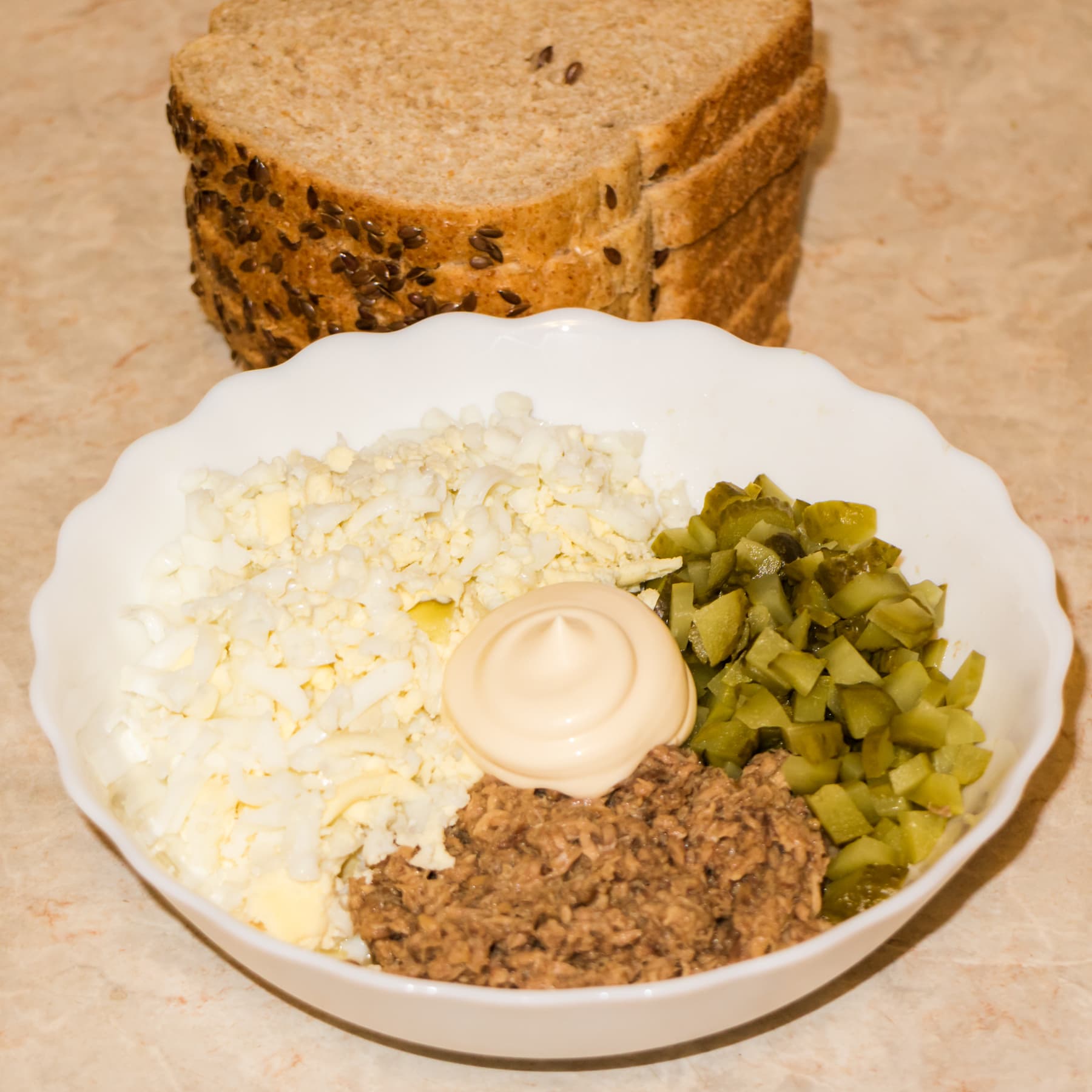 Сначала была приготовлена начинка. На одну стандартную баночку тунца мы взяли два яйца, несколько маринованных огурцов и пару столовых ложек майонеза. Слили из консервов жидкость, тунец размяли, яйца натерли, огурчики мелко нарезали. Все тщательно перемешали с майонезом.