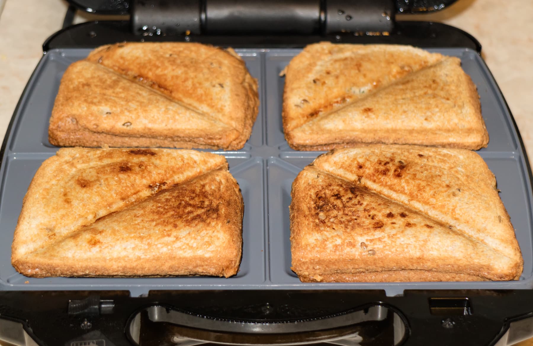 Положили начинку на один ломтик хлеба, сверху прижали другим. Тепловая обработка составила около пяти минут. Панели установили с зазором между ними, что без усилий позволяет сделать защелка на ручках мультипекаря.