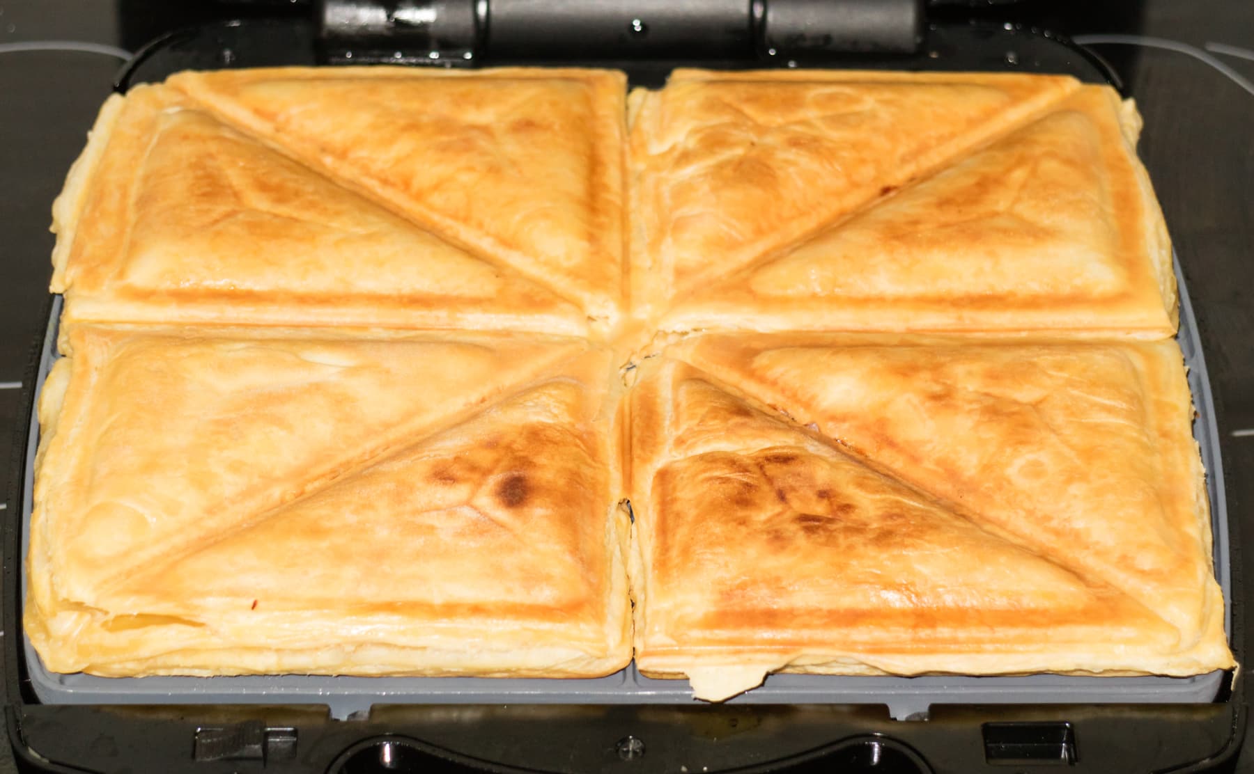 Разморозили готовое бездрожжевое слоеное тесто. Приготовили начинку: смешали мелко нарезанную ветчину и натертый на крупной терке сыр. Разделили пласт теста на 8 частей так, чтобы получить четыре больших прямоугольных пирожка, которые потом планировали разделить на два треугольника. Позже мы поняли, что делить тесто на порционные прямоугольные кусочки совсем необязательно. Можно было разделить тесто на две части по размеру панелей, то есть выкладывать на нагретую панель один большой пласт теста. Затем по центру углублений расположить начинку и прикрыть другим слоем теста. Выступы, которыми оснащена форма, неплохо прижимают и формуют выпекающиеся заготовки.