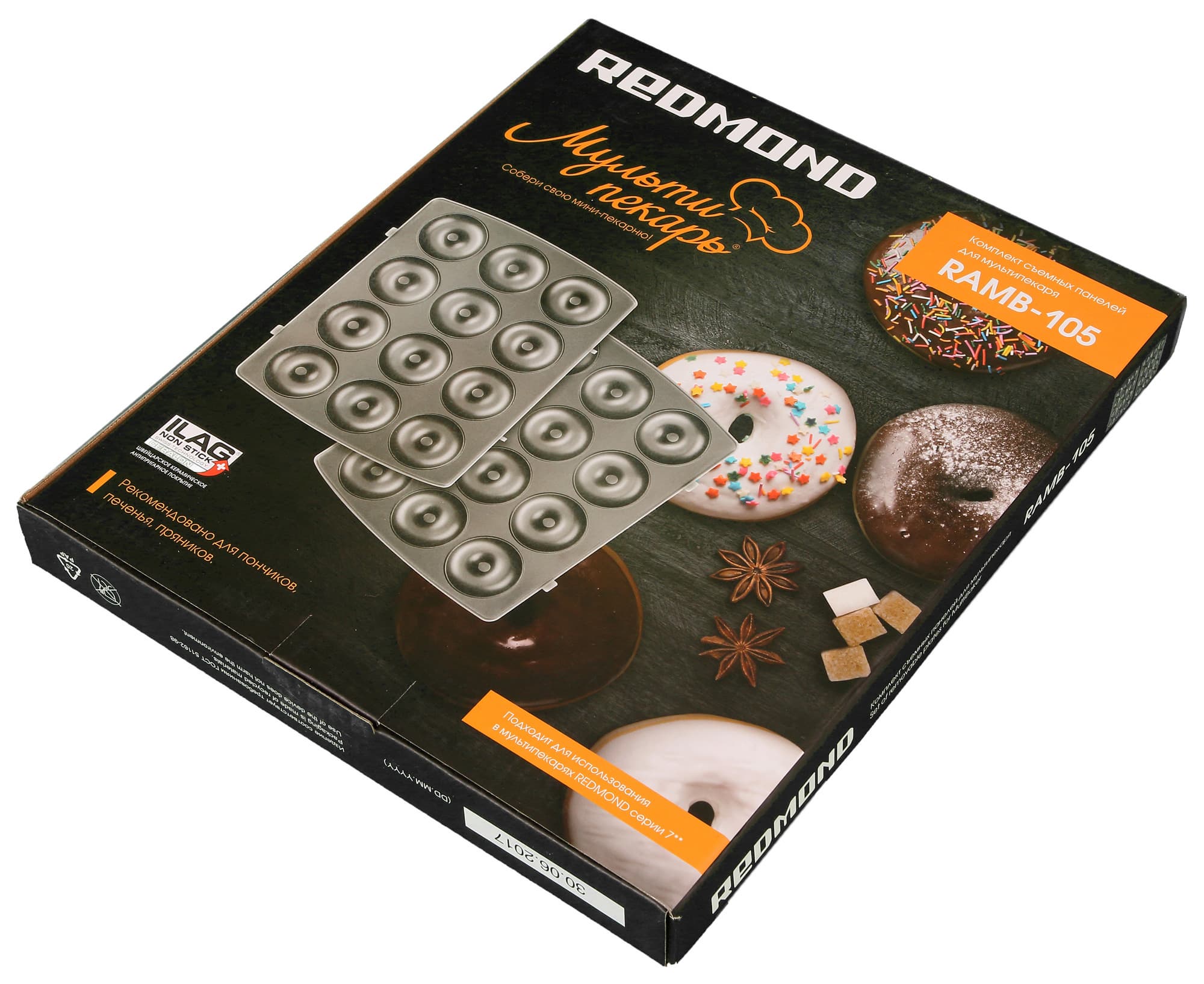 Дополнительно на тесты производитель прислал три дополнительные панели: для печенья «Орешки» (RAMB-118), для горячих сэндвичей (RAMB-101), для пончиков (RAMB-105). Панели поставляются в небольших коробках размером 25×3×28,5 см. На упаковке изображены сами панели и варианты изделий, которые можно с их помощью испечь. На задней стороне приведен рецепт блюда, фотография с вариантом сервировки или украшения и краткие технические характеристики.