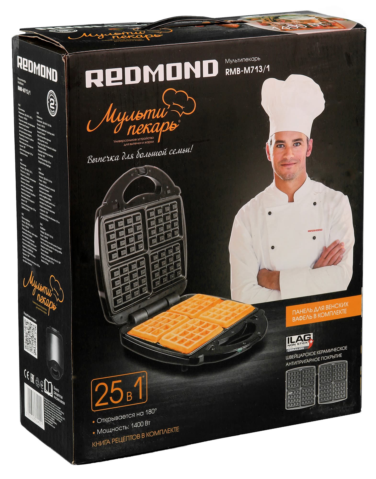 Однако Redmond RMB-M713/1 отличается от младшей модели не только размером и мощностью. Например, в данной модели предусмотрена возможность использовать прибор в открытом положении — в этом случае обе панели образуют единую жарочную поверхность. Разнообразные съемные панели позволят приготовить с помощью мультипекаря не только вафли и печенье разных видов и форм, но также пиццу, бургеры, пироги, омлет и многое другое. Отдельно радует возможность использовать мультипекарь в качестве контактного гриля.
