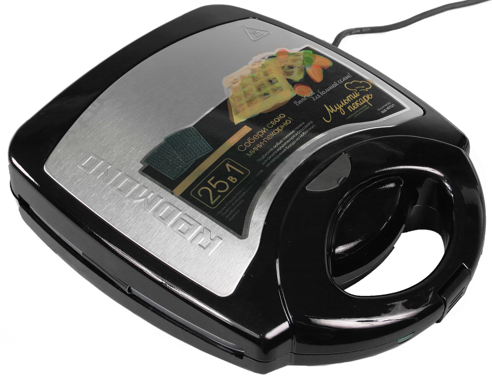 В сложенном виде мультипекарь похож на небольшой пластиковый чемоданчик с ручками. Изготовлен корпус прибора из пластика и вставок из металла. Углы корпуса скруглены.