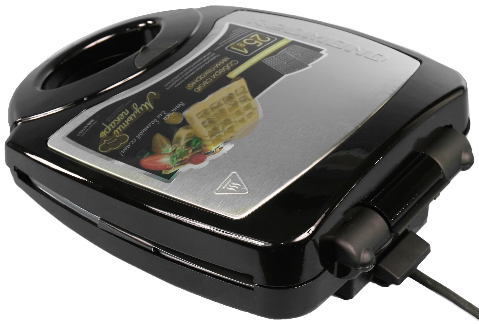 Коробка исполнена в фирменном стиле Redmond: однотонный темный фон, яркие изображения и большое количество текстовой информации. На черном фоне размещены фотографии устройства и вафель, которые можно испечь с помощью входящих в комплект панелей. Информация, приведенная на боковых сторонах, поможет ознакомиться с краткими техническими характеристиками устройства и ассортиментом съемных панелей, которые можно приобрести дополнительно. Вообще, изучение упаковки позволит составить первое впечатление о приборе, даже не распаковывая его. Коробка удобного размера оснащена ручкой для переноски.