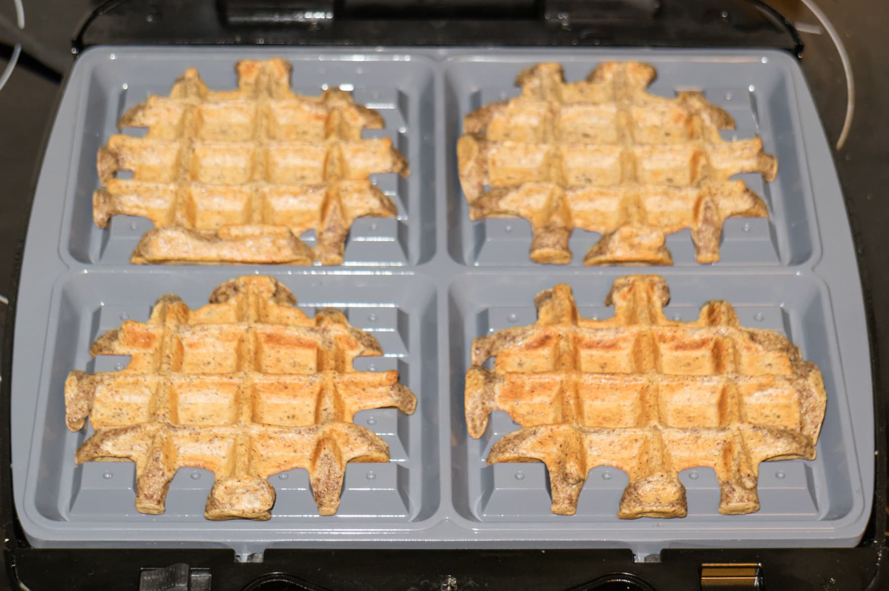 По умолчанию прибор укомплектован панелями для выпечки толстых бельгийских и венских вафель. За одну итерацию можно испечь четыре довольно крупных по размеру (10×12 см) изделия.