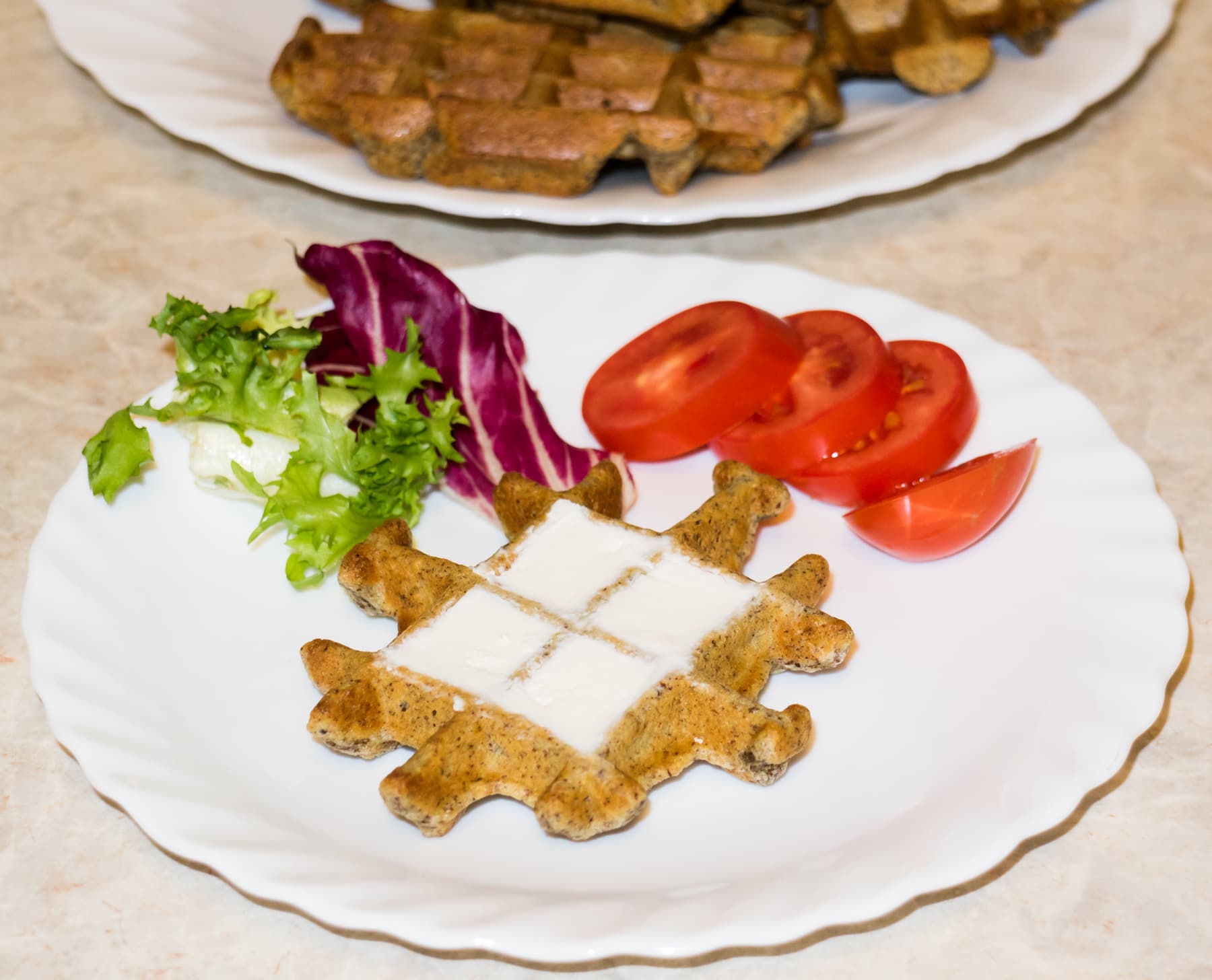 Получили прекрасные вафли — пышные, несладкие, хрустящие снаружи и мягкие внутри. Подавали с мягким творожным сыром и свежими овощами. Данные вафли хорошо заменяют хлеб. Можно их употреблять и со сладкими начинками, например джемом, шоколадной или ореховой пастой.