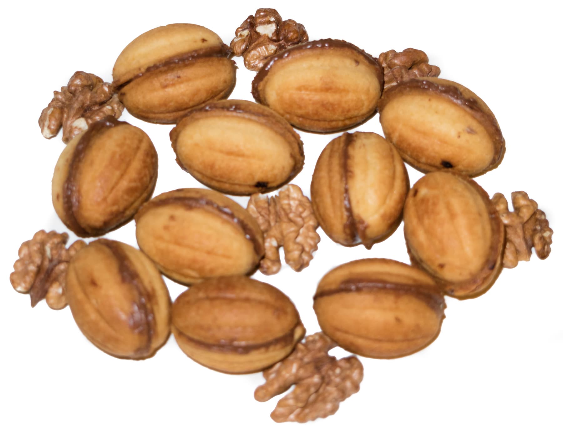 Орешки не прилипали к панелям, скорее наоборот, при выпечке из них выделялись небольшие излишки масла, скапливавшиеся на поверхности панелей. По завершении выпечки оставили печенье остывать, в это время подготовили начинку. Взяли Нутеллу, добавили в нее обжаренные и измельченные грецкие орехи. Наполнили орешки начинкой и скрепляли две половинки, соединяя их.