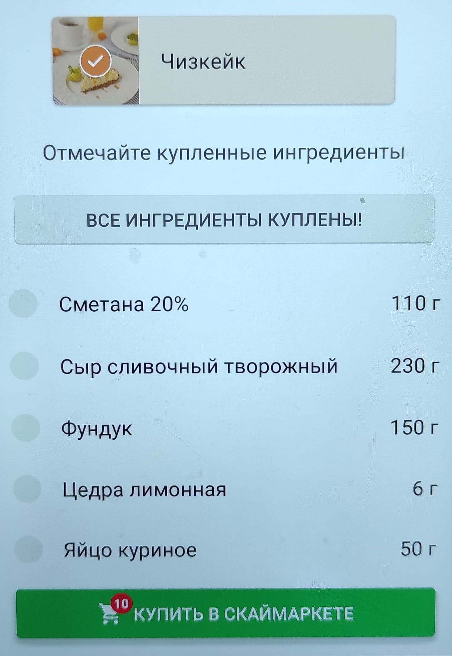 Одним кликом можно добавить ингредиенты в список покупок, чтобы следующим шагом перейти в Скаймаркет.
