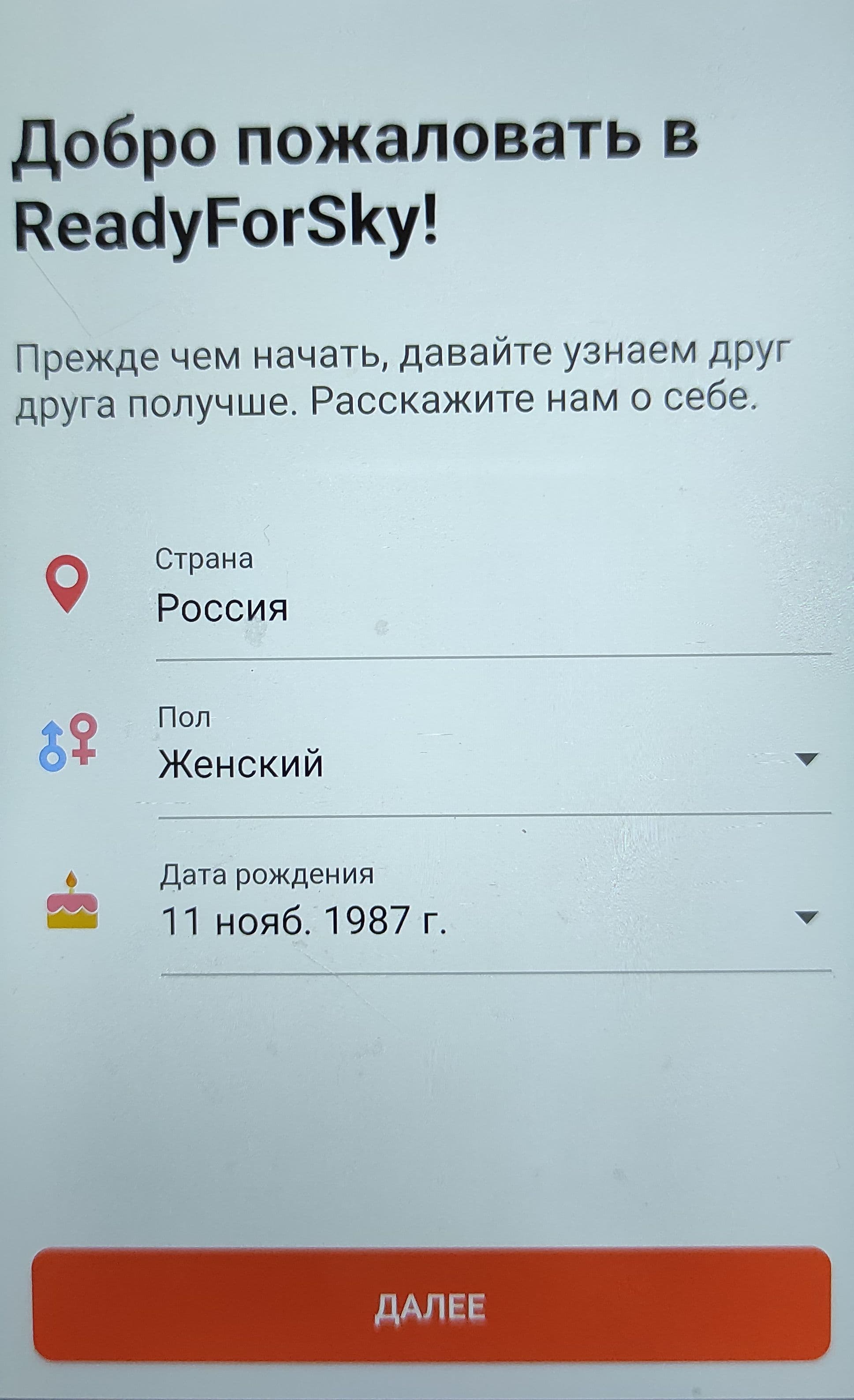 Следуя указаниям инструкции, мы скачали официальное приложение Ready for Sky и зарегистрировали новый аккаунт. Для этого достаточно ввести email и придумать пароль, никаких подтверждающих ссылок и номеров телефона. Затем приложение попросило указать страну, пол и дату рождения, и наконец, можно было начинать работу.