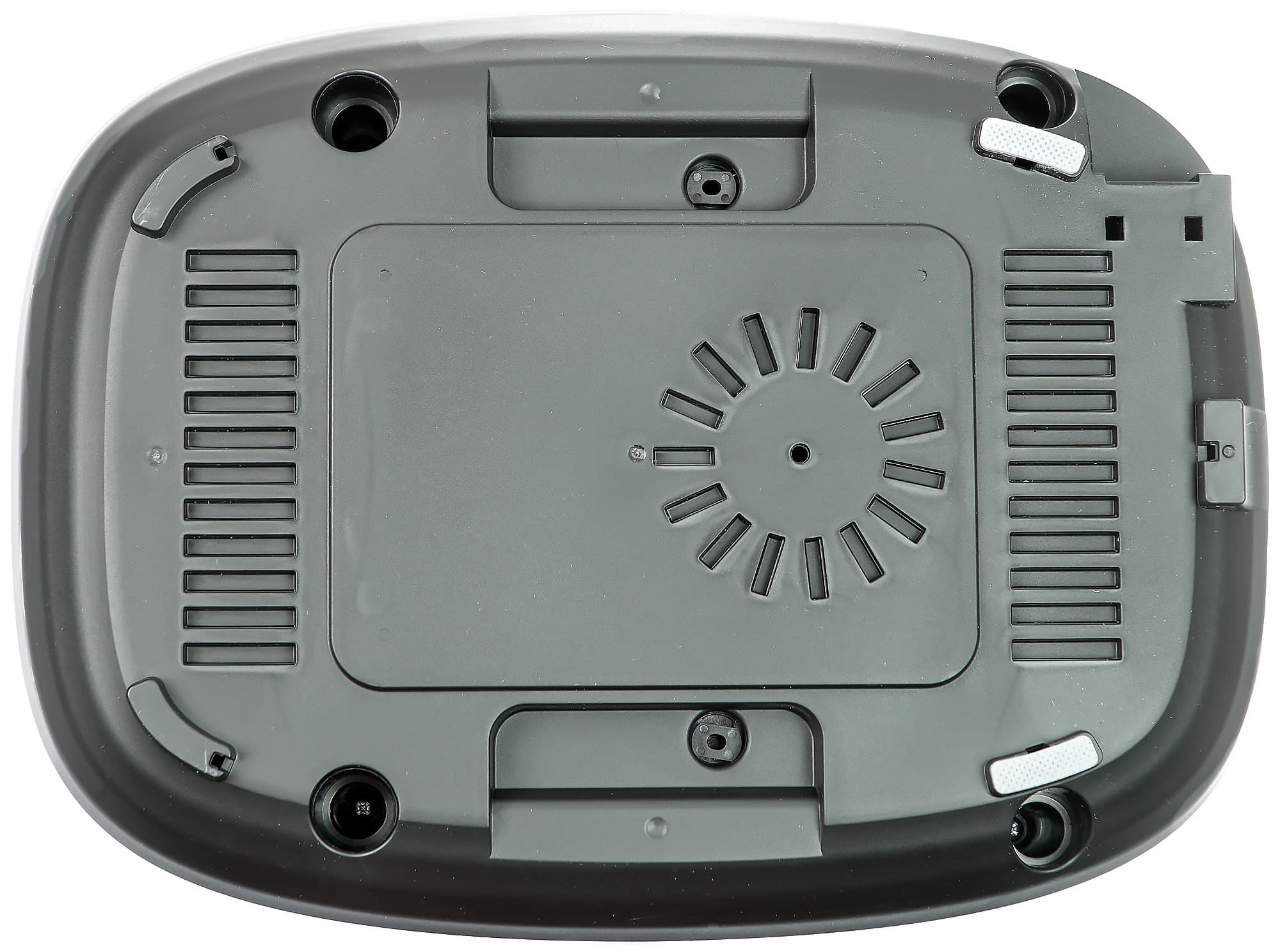 Размеры мультиварки можно назвать стандартными, форма скругленного прямоугольника вытянута вперед: в целом, все удобно и привычно. Большая ручка для переноски традиционно отводится назад, под ней находится накопитель для конденсата. Внизу чуть по диагонали находится отверстие для сетевого кабеля.