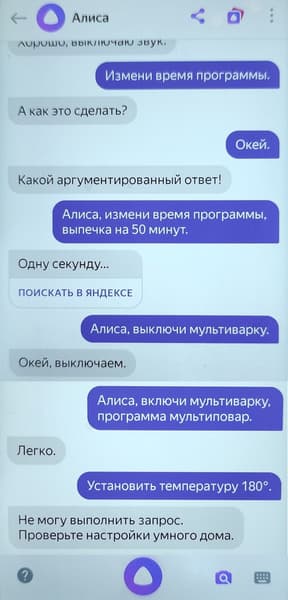 К нашему приятному удивлению, Алиса моментально откликнулась: сначала просто включила мультиварку, затем запустила выбранную нами программу, убрала автоподогрев и выключила прибор. Сначала ее ответы озвучивались, потому отчего-то стали отображаться текстом. Однако наша радость омрачилась неумением Алисы изменять настройки времени и температуры, как видно из скриншотов, и при этом она умудрялась проявлять ехидство. Итого при управлении через пульт Яндекс или голосом придется принять ограничения настроек программ приготовления по умолчанию. Или обучить Алису.