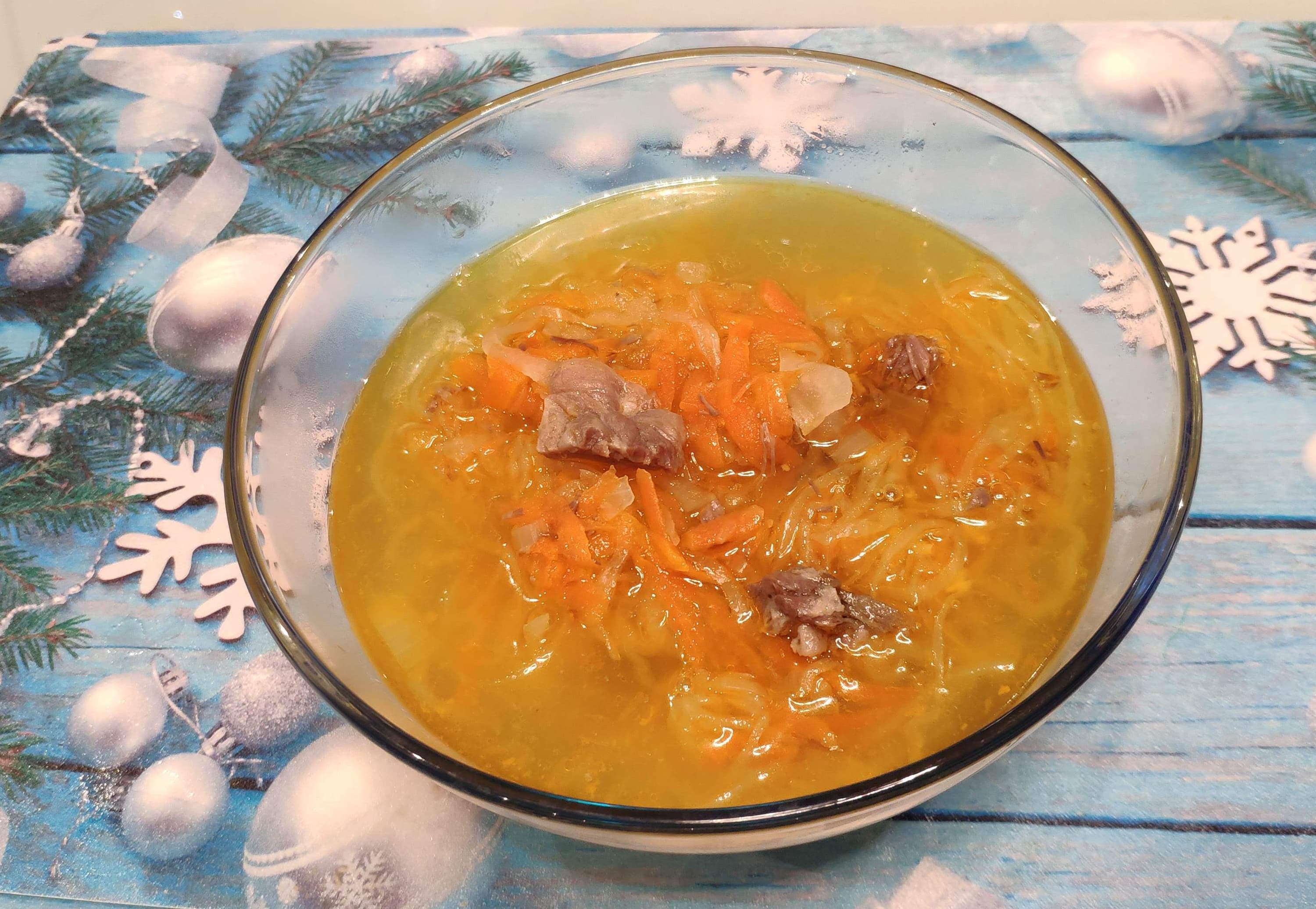 Порядок действий традиционный для супов в мультиварках: запустить режим «Жарка», дождаться нагрева чаши с маслом и обжарить овощи: нарезанный соломкой лук и натертую на крупной терке морковь. По рецепту на жарку отводится 5 минут, но мы продлили время до 10 минут, постоянно помешивая. Далее мы добавили нарезанное кубиками мясо и картошку и залили все бульоном вместо воды, раз уж он у нас был. Свежую капусту в количестве 300 г мы заменили квашеной, заодно избежав шинковки. Установили программу «Суп» на 1 час 25 минут и по ее окончании получили наваристые ароматные щи.