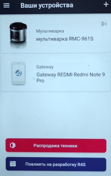 Чтобы не привязываться к зоне действия Bluetooth (около 15 метров) и управлять устройством откуда угодно, можно установить отдельное приложение R4S (сокращение для Ready for Sky) Gateway на тот смартфон или планшет, который будет постоянно находиться неподалеку от прибора и не отключать Bluetooth. Также к таким устройствам предъявляются определенные требования по версии операционной системы Android и iOS. Мы ввели те же логин и пароль, что в основном приложении Ready for Sky, дали гейтвею имя и легко обнаружили в списке устройств знакомую мультиварку.