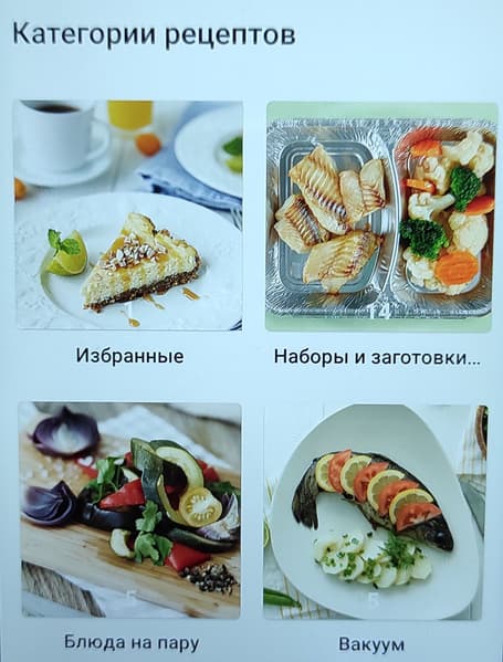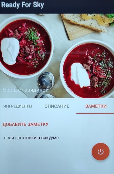 Примечательно, что они не совпадают с книгой рецептов, и есть довольно необычные варианты, например, борщ за 10 минут из вакуумированных заготовок. При выборе рецепта можно посмотреть его описание, список ингредиентов и раздел заметок. Создавать собственные рецепты в приложении нельзя, но можно писать заметки к понравившимся.