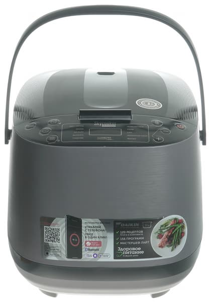 Над коробкой торчит черная пластиковая ручка, что делает переноску весьма удобной, особенно учитывая небольшой вес прибора. QR кода на упаковке целых два: один ведет на страницу модели, другой к приложению Ready for Sky, за использование которого производитель прибавляет 1 год гарантии. Из нового на черном фоне выделяется инфографика о совместимости с голосовыми помощниками Алисой и Марусей. Прогресс шагает вперед неумолимо, и осталось только дождаться мультиварку, которая сама положит в себя продукты из холодильника (зато уже работает заказ из СкайМаркет).