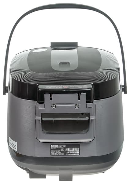 Мультиварка Redmond RMC-961S порадовала нас строгим дизайном: черный глянцевый пластик и матовый серый с легким эффектом потертого металла. Перед и бока корпуса освобождены от визуального шума (если не забыть снять рекламную наклейку). Управление вынесено на верхнюю сторону, рядом с крышкой, что нам кажется более удобным, ведь мы смотрим на прибор сверху вниз.