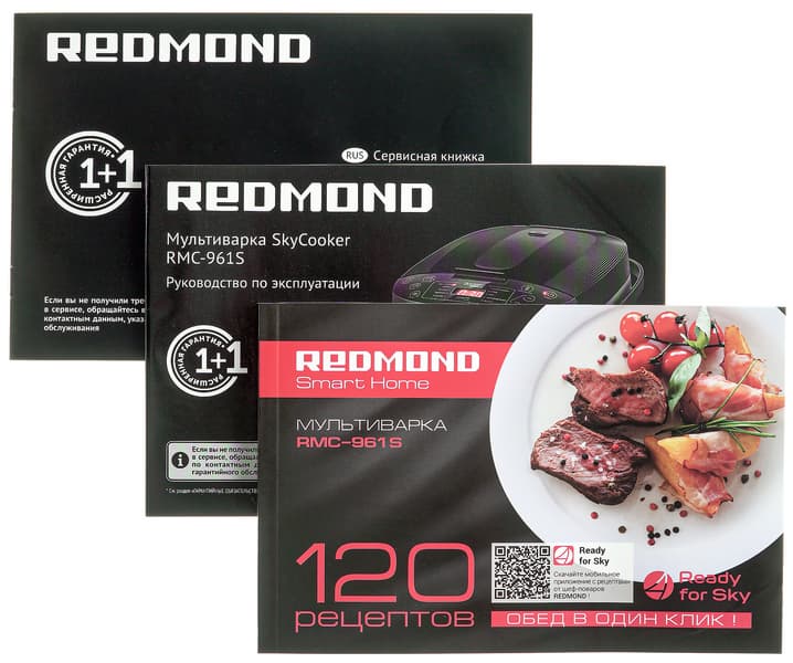 Главное отличие модели RMC-961S мы видим в акценте на технологии беспроводного управления: мультиварка запускается через приложение Ready for Sky и реагирует на команды, посылаемые со смартфона через гейтвей с использованием Bluetooth. На текущий момент компания Redmond предлагает синхронизировать свое приложение с Алисой Яндекса и Марусей Mail.ru, постепенно приближая реальность умного дома, где техника управляется со смартфона. В книге рецептов на каждой странице рекламируется Скаймаркет, где можно заказать продукты для рецепта в одно касание — этот параметр пока не настроен, но можно предположить, что это лишь вопрос времени, когда дистанционная покупка продуктов стала привычной в 2020 году.