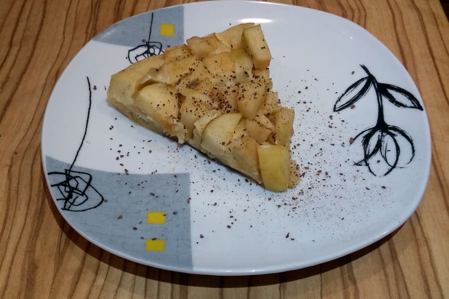На сей раз книга рецептов нас удивила, предложив рецепт с преобладанием яиц и яблок и совсем без сметаны. Поэтому мы воспользовались проверенным вариантом: взбили 2 яйца с сахаром, смешали муку и сметану в равных пропорциях (по 200 г), добавили еще 50 г сахара и, собственно, яблоки — единственное, где мы совпали с рецептом, нарезав 300 г зеленых яблок мелкими кубиками. При желании можно добавить разрыхлитель и корицу, но мы предпочитаем более сочное и плотное тесто. Полученную смесь мы залили в смазанную маслом чашу (скорее по привычке, ведь там антипригарное покрытие) и установили программу «Выпечка» на 50 минут, предварительно отключив автоподогрев. Шарлотка получилась ровно такой, как хотелось: аккуратно подрумяненной снизу, сочной внутри, с мягкими яблоками сверху, сохранившими кислинку. Для подачи мы присыпали ее корицей и кардамоном.