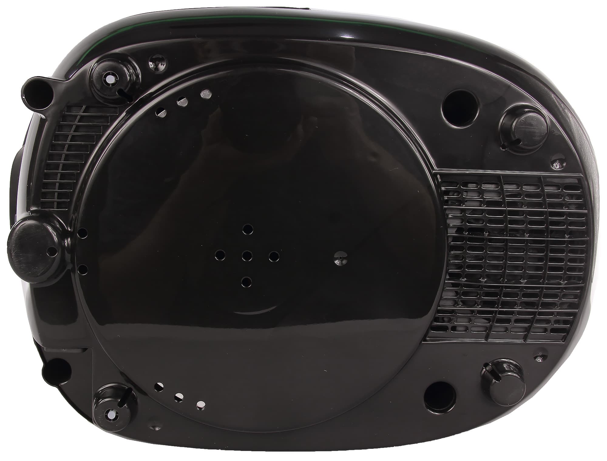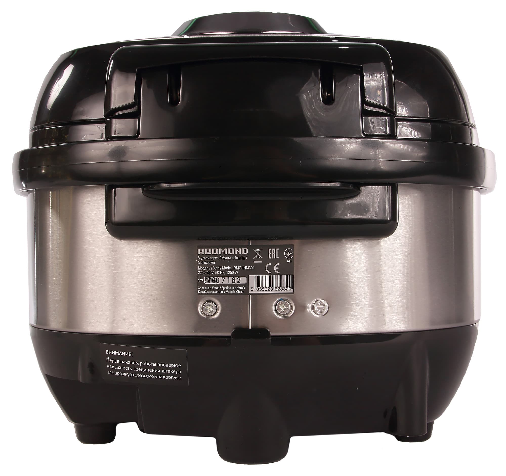 На первый взгляд индукционная мультиварка не сильно отличается от обычной (не индукционной). Перед нами предстала классическая мультиварка Redmond: корпус прибора сделан из прочного пластика и нержавеющей стали. Снизу можно увидеть ножки (передние пластиковые, задние с резиновым противоскользящим покрытием) и вентиляционную решетку, за которой прячется вентилятор охлаждения.